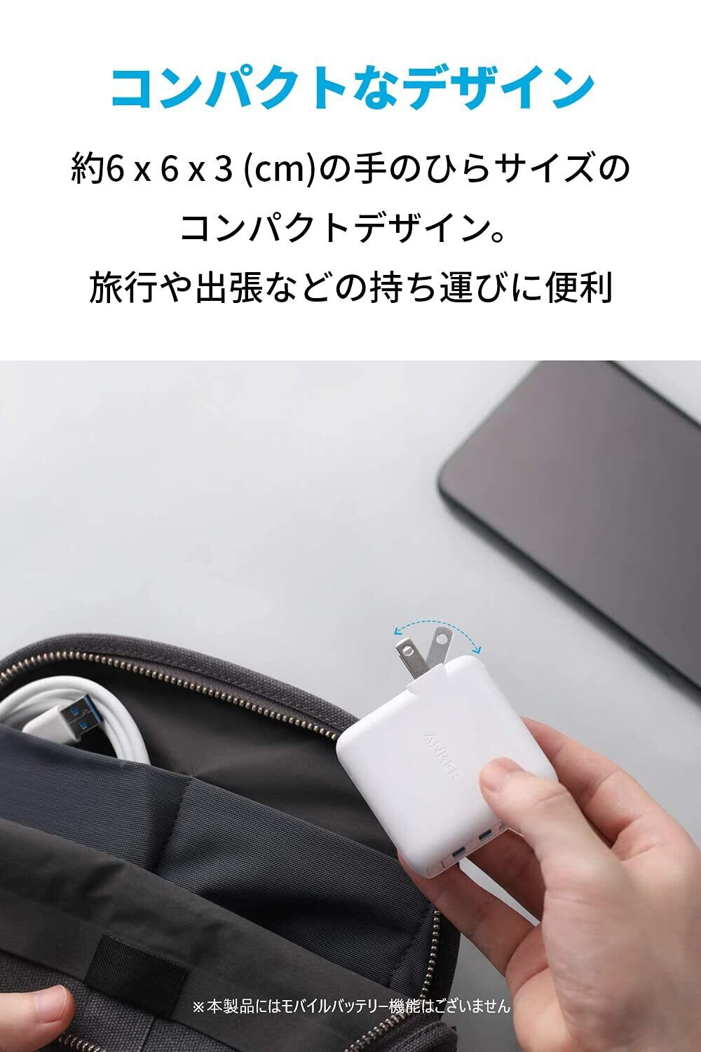 旅行に最適:折りたたみ式プラグおよびコンパクトサイズで持ち運びやすさを追求しました。また世界各国の電圧(AC 100-240V)に対応しているので海外旅行にも最適です。
