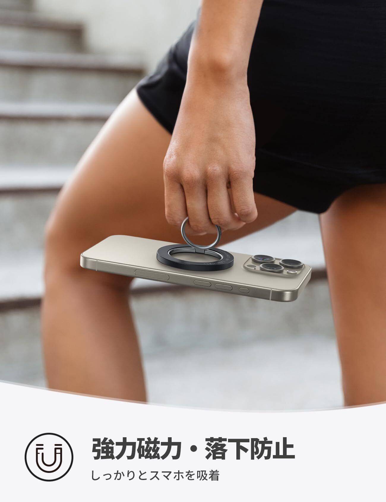 【強力磁力でしっかりと吸着】約1000gまでの荷重に耐える強力磁力です。iPhone 17/16/15/14/13シリーズをしっかりと吸着できます。マグネット式スマホリングで、iPhone MagSafe シリーズ本体やMagSafe搭載ケースに簡単に装着できます。また、マグネットなので跡を残さず取り外し可能です。テープ跡や糊残りを気にせずお使いのスマホをきれいな状態でご利用いただけます。