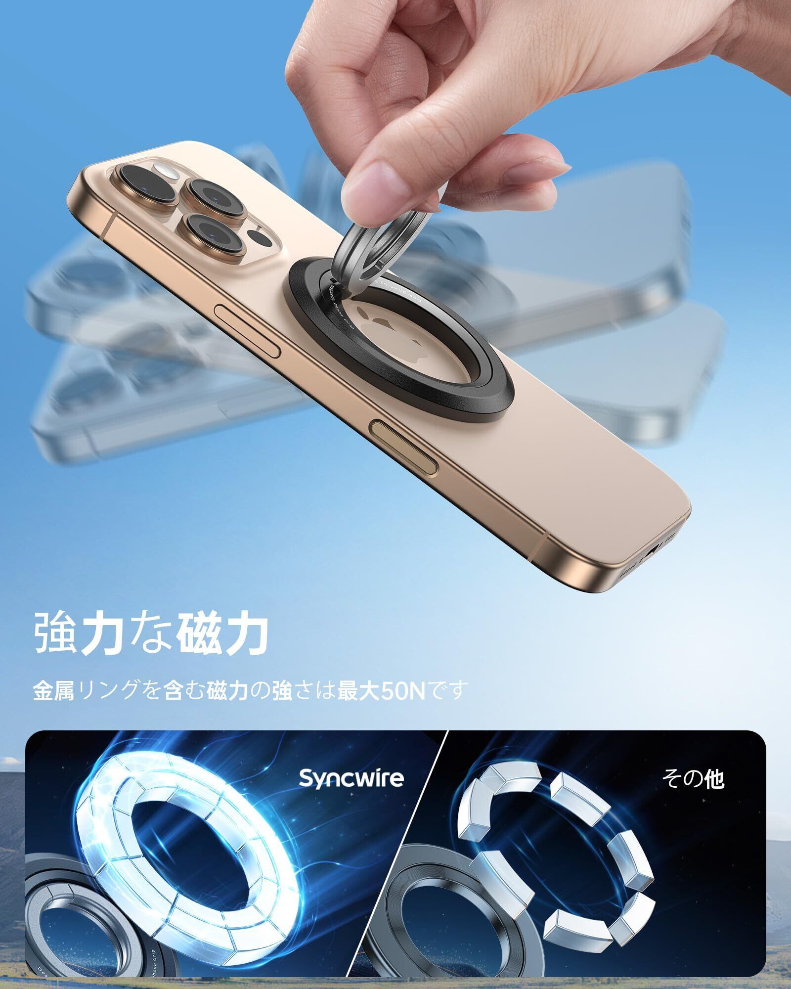 【2022最新】SYNCWIRE MagSafe用スマホリング - 360°回転 マグセーフ リング 両面マグネット バンカーリング 携帯リング 超強力磁気 横/縦置き 折りたたみ 角度調整 簡単取り付け 2枚メタルリング付 iPhone 17 16 15 14 13 12 Pro Max Plus Air Androidなどに対応しています