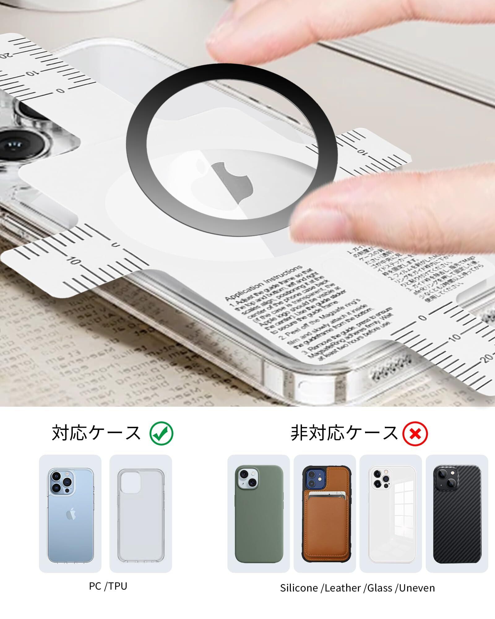 【簡単装着・安心ガイド付き】付属の位置調整カードを使えば、簡単に正確な位置にmagsafe リングを装着可能です。スマホケースの表面をきれいにしてから使用してください。シリコン、革、ガラス製のケースには対応していませんのでご注意ください。スマートフォン本体ではなく、スマホケースに取り付けることをおすすめします。