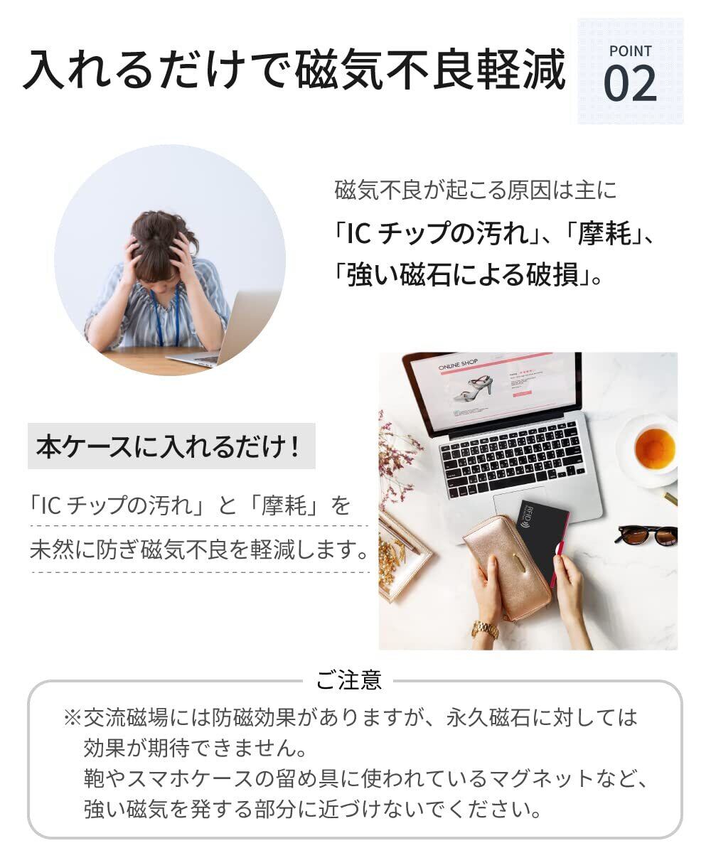 磁気不良軽減 : 磁気不良が起こる原因は主に「ICチップの汚れ」、「摩耗」、「強い磁石による破損」。本ケースに入れるだけで、「ICチップの汚れ」と「摩耗」を未然に防ぎ磁気不良を軽減します。※交流磁場には防磁効果がありますが、永久磁石に対しては効果が期待できません。鞄やスマホケースの留め具に使われているマグネットなど、強い磁気を発する部分に近づけないでください。