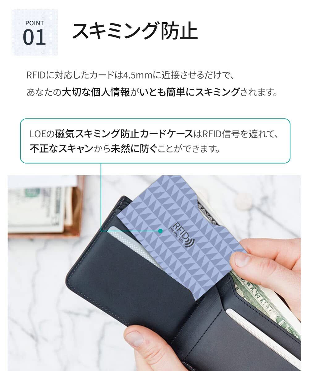 スキミング防止 : RFIDに対応したカードは4.5mmに近接させるだけで、あなたの大切な個人情報がいとも簡単にスキミングされます。LOEの磁気スキミング防止カードケースはRFID信号を遮れて、不正なスキャンから未然に防ぐことができます。