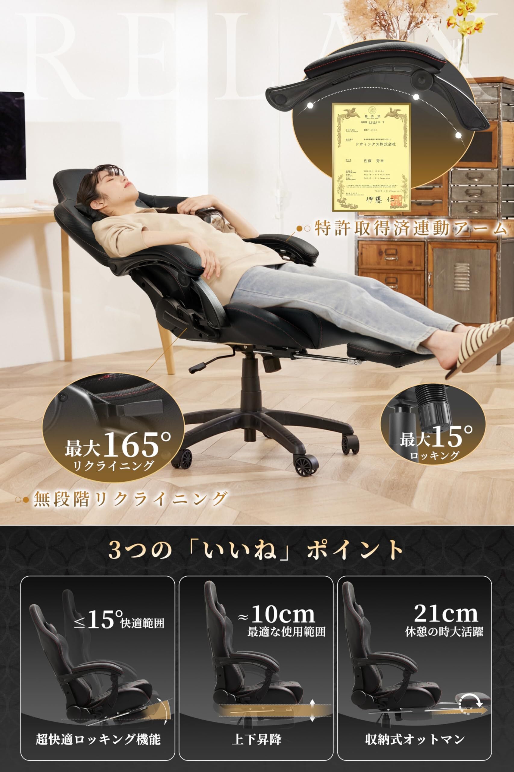 【多様な機能】 165°リクライニング機能と15°ロッキング機能を組み合わせ、180°のフルリクラインを実現。これにより、まるで第二のベッドのような快適さを提供します。多様な働き方や座り姿勢に合わせて、レバー操作で簡単に調整できます。静音キャスターを5つ装備し、スムーズな移動が可能。座面下の収納式オットマンにより、簡単に休憩スペースを設けられます。リクライニング時のアームレストの動きも調整でき、どんな角度でも快適に肘を置くことができます。