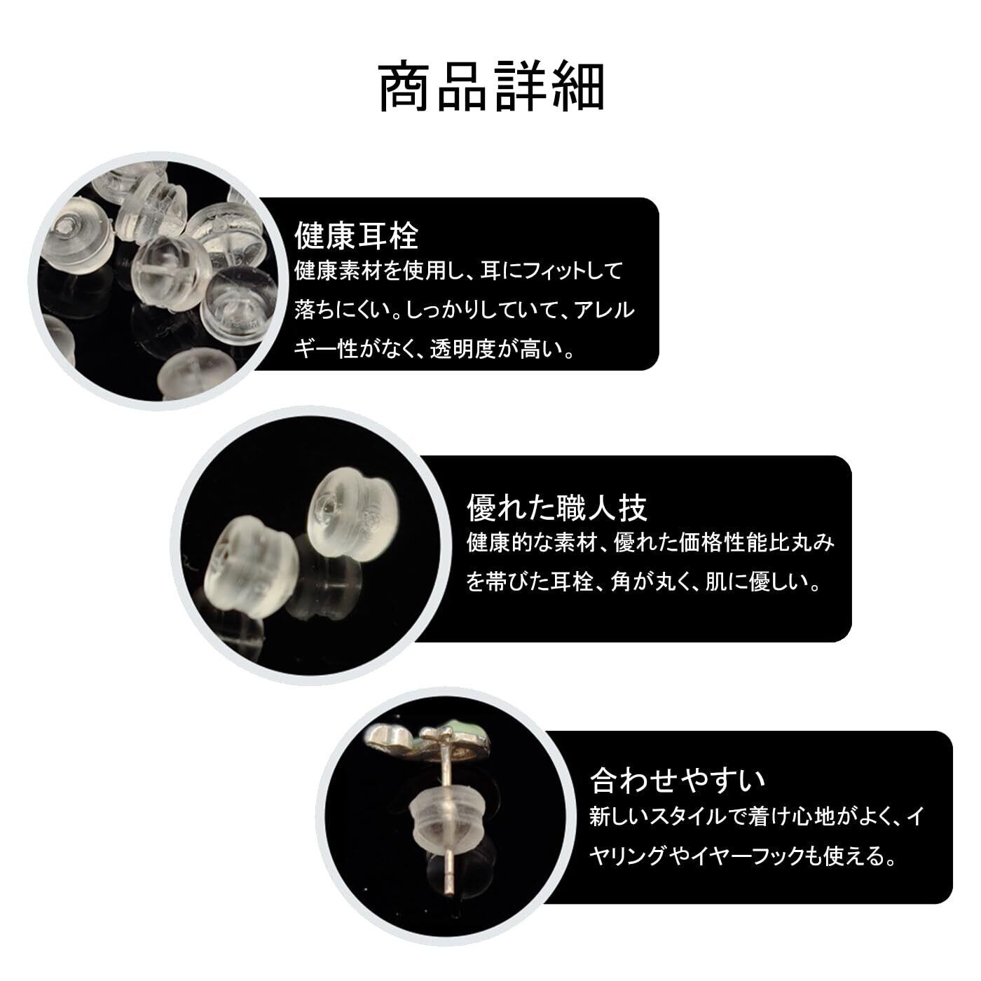 【色と素材】:透明なデザイン、シンプルで寛大な、すべてのスタイルのイヤリングに適しています。 高品質のシリコンを使用し、安全で無毒です。金属アレルギーの方にもお使いいただけます。