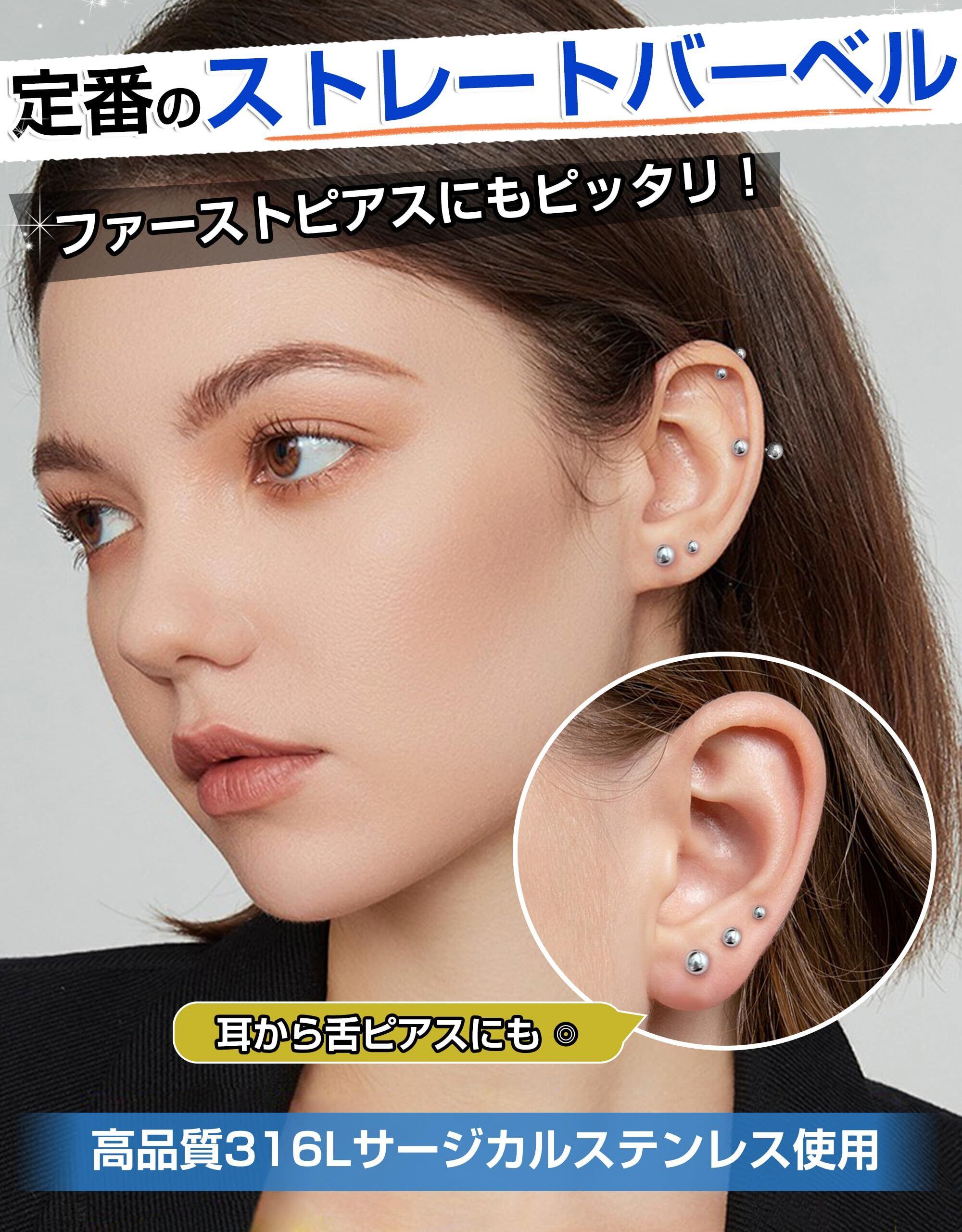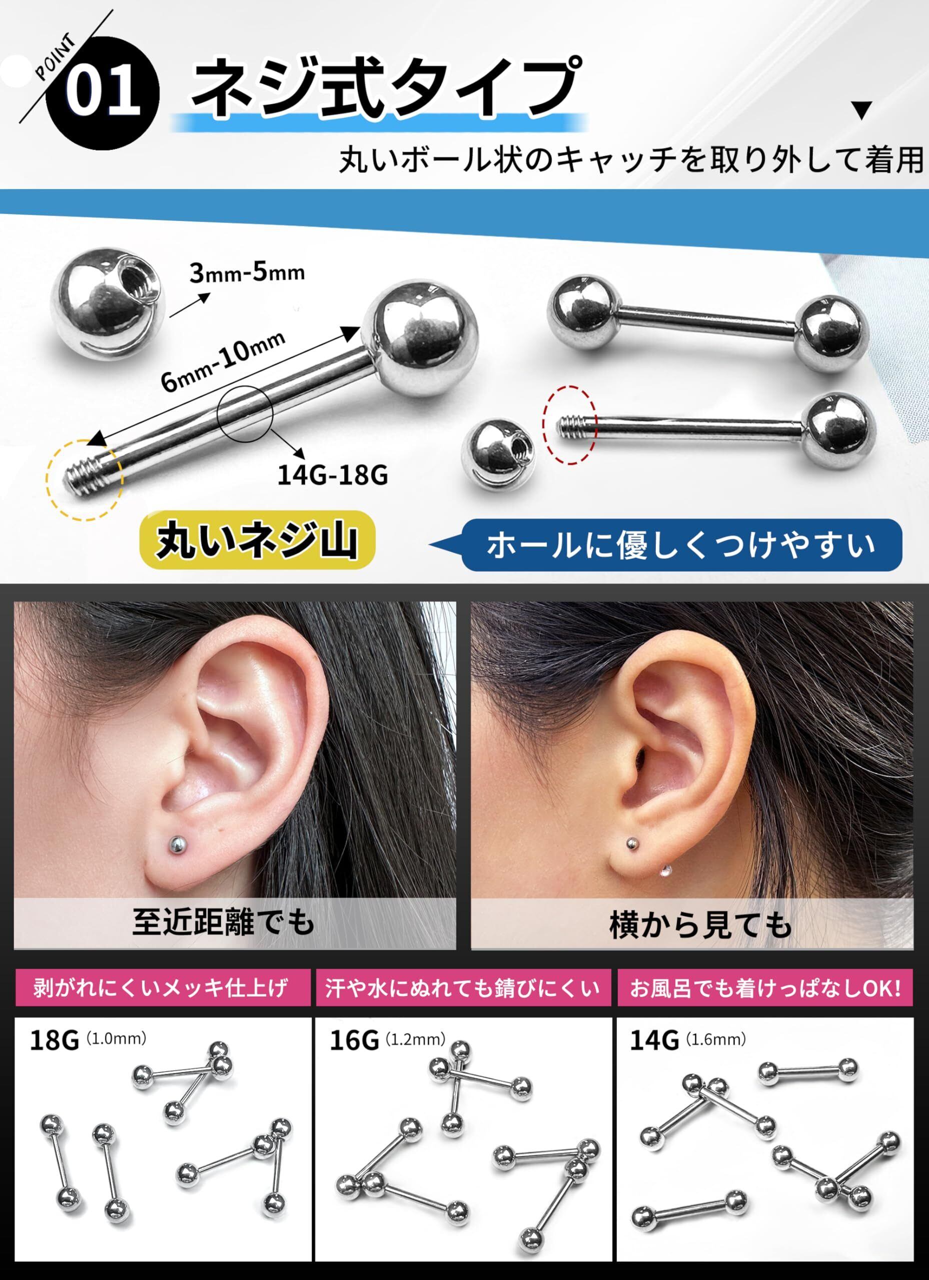 【内容・選べるサイズ】内容:8本ボディピアス + 1個収納ケース ※太さ(ゲージサイズ)14G/16G/18Gの3サイズ、軸長6mm/8mm/10mmの3種、ボール内径は3mm/4mm/5mmの3種のボディピアスセット販売になります。※薄さ、厚さ、ホールの角度により個人差がありますので自分に合った内径サイズをお求め下さい。