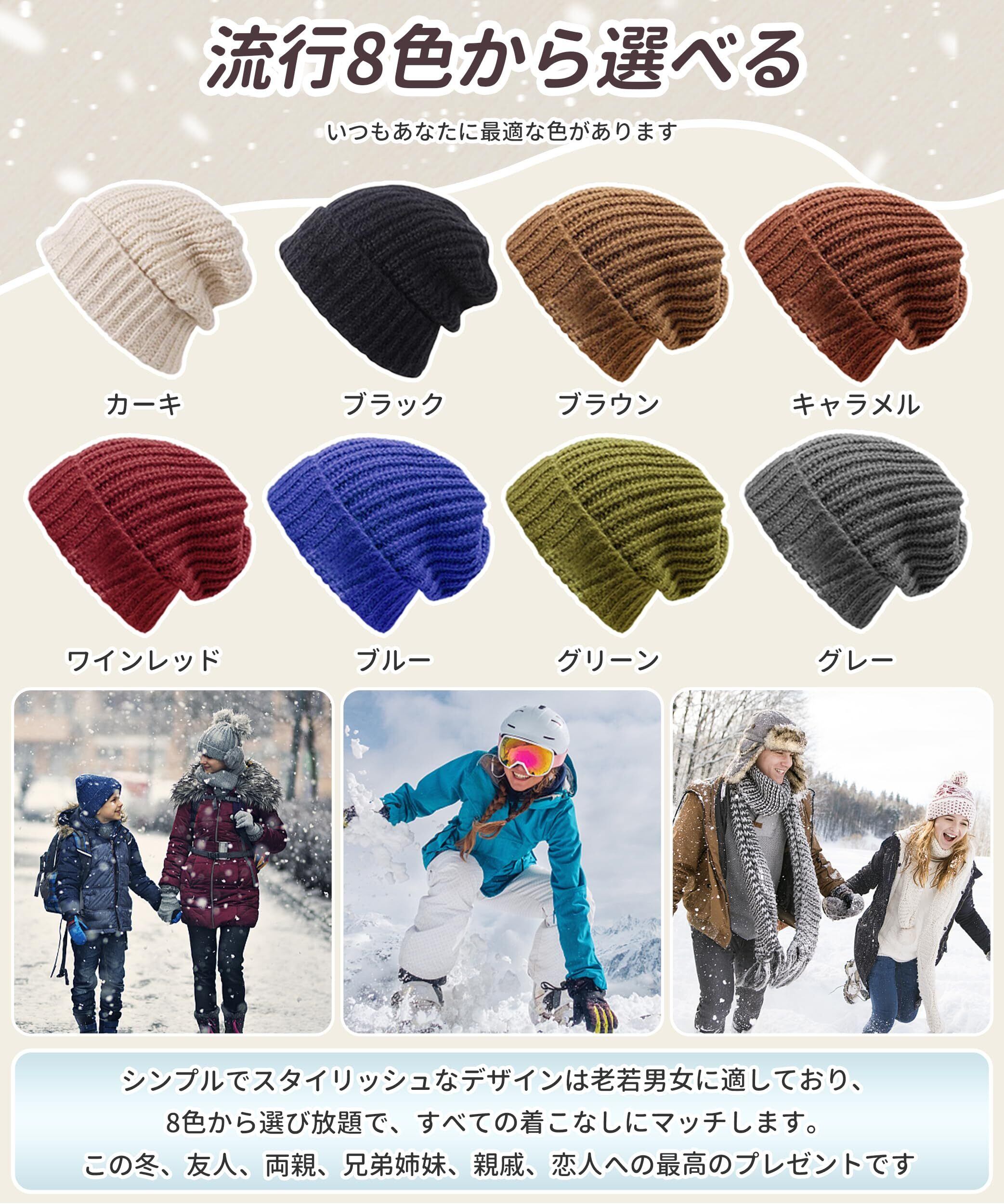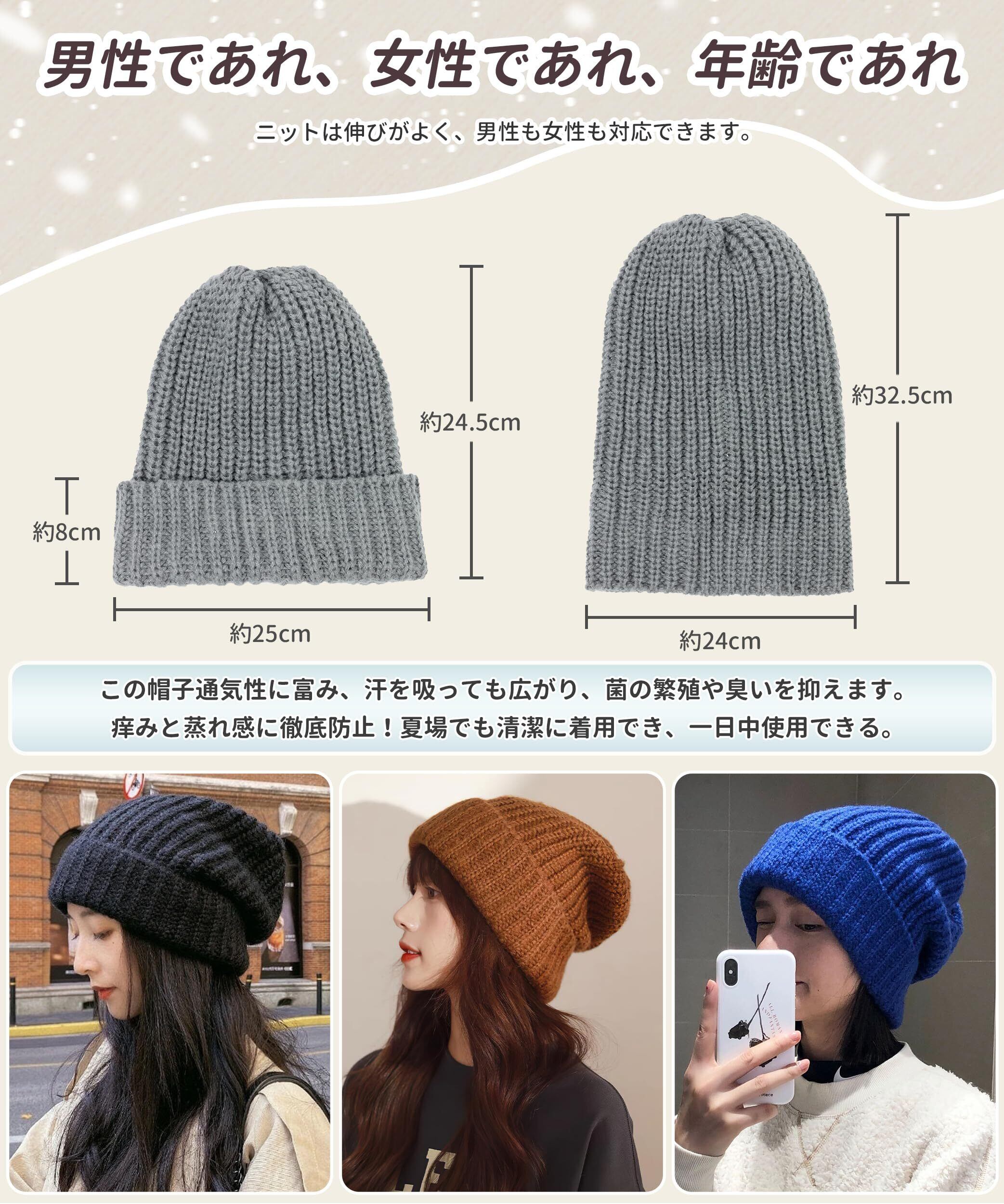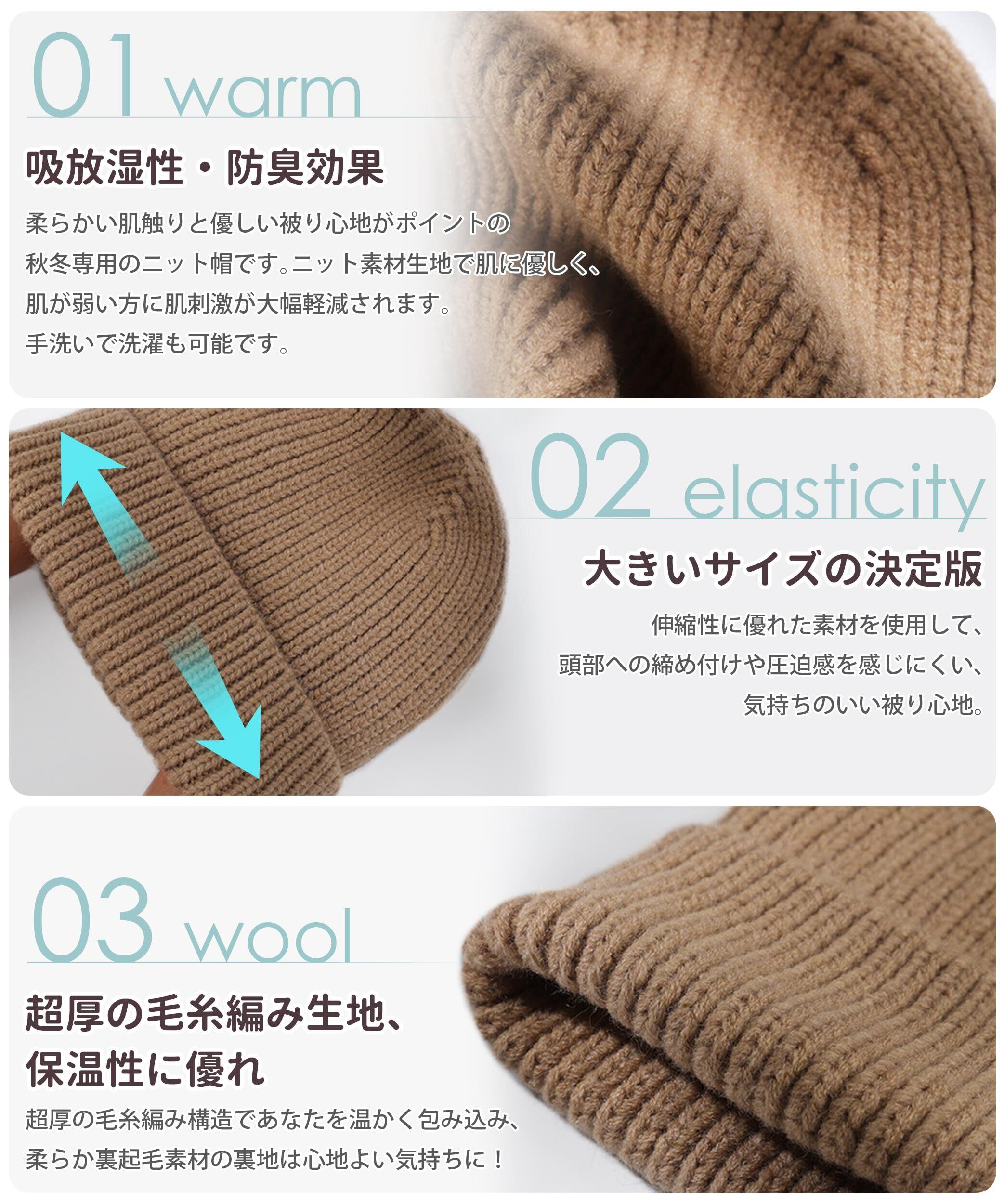 【定番型のニット帽・究極の防寒対策】超厚の毛糸編み生地で、縫製されたニット帽は、ふんわりと頭を包み込む軽い被り心地、肌にやさしいで伸縮性にも保温性にも優れ、ファッション感と保温性を両立した秋冬向きのニット帽子です。寒い日にニット帽を耳に引き寄せたり、頭や耳を保温するのに十分な暖かさを提供します。ふんわり肉厚な生地感で保温性に優れているので、お酒落なだけしゃなく防寒対策としてもかぶれる優秀ニット帽です!