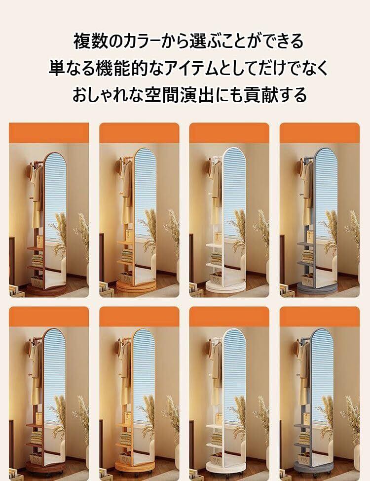 【新春セール】全身鏡 全身ミラー 360度回転 収納付ミラー ミラーラック 木製 木目調 ハンガーラック付き ハンガーフック付き スタンドミラー 円型姿見鏡 (ホワイト(キャスター付き), 長さ172 x 幅40 cm)