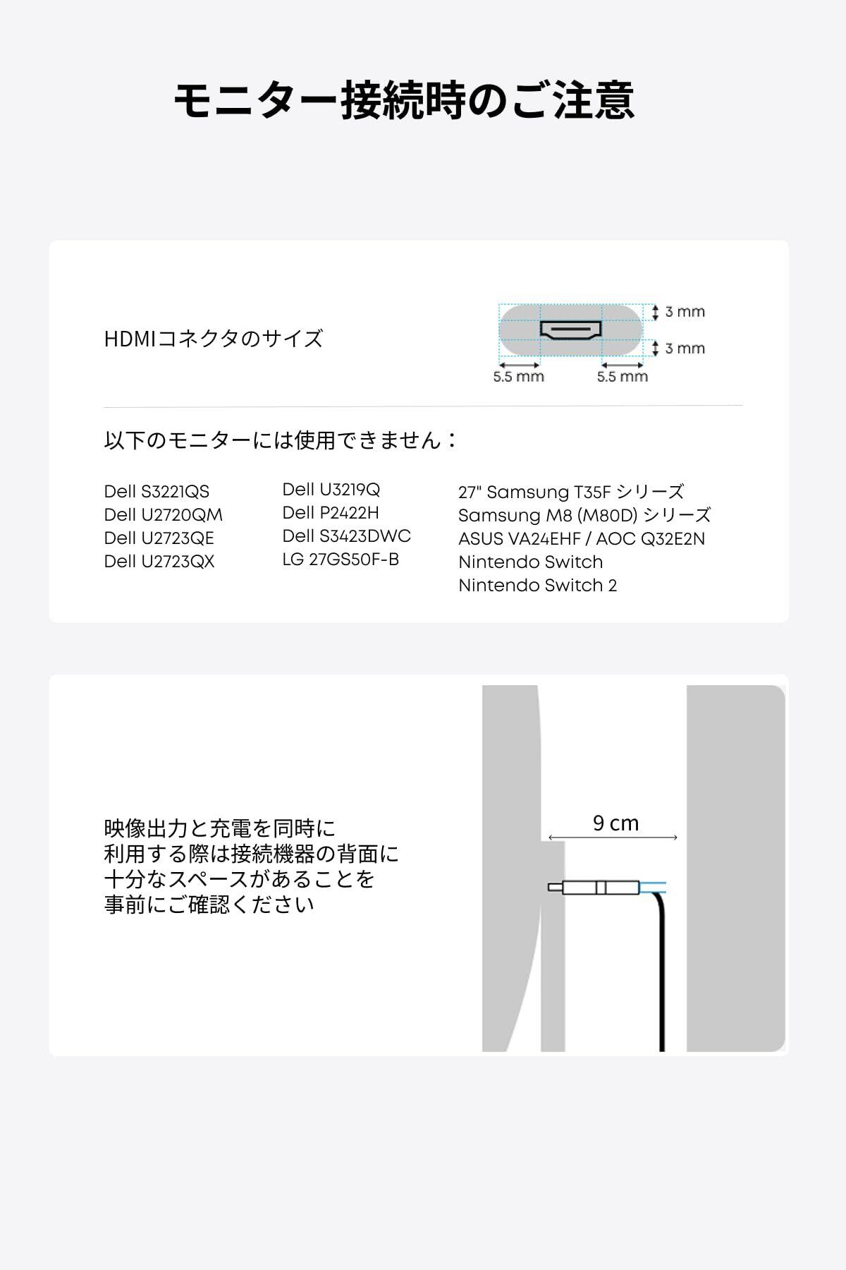 2つのケーブルを1つに:HDMI端子部分にUSB-Cポートも搭載されているためめ1本のケーブルで画面出力と機器への充電両方に対応しています
