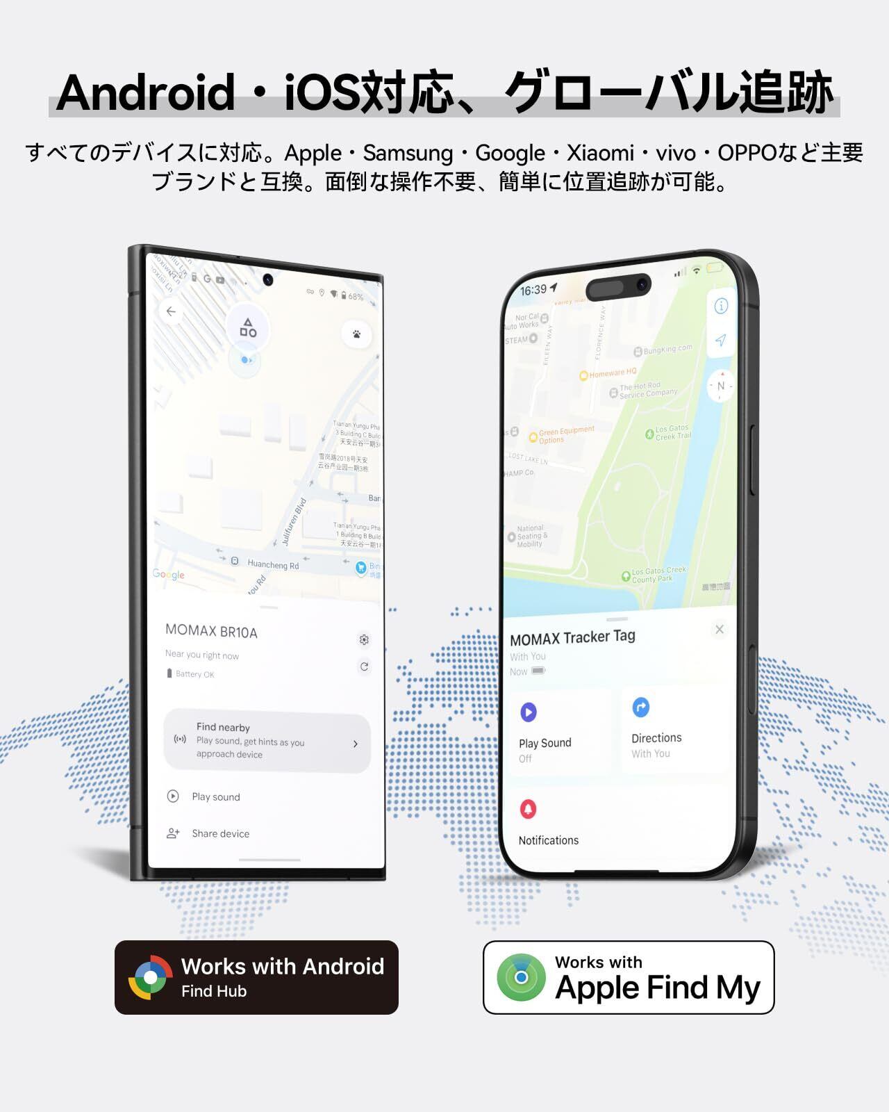 【 Apple「探す」にも対応】Googleの「検索ハブ(Find hub)」だけでなく、Appleの「探す(Find My)」にも対応できます。iPhone・iPad・Macから簡単に連携でき、大切な持ち物の位置を正確に特定できます。リアルタイムで更新されるため、世界中どこにいても追跡可能。Appleユーザーも安心してご利用いただけます。
