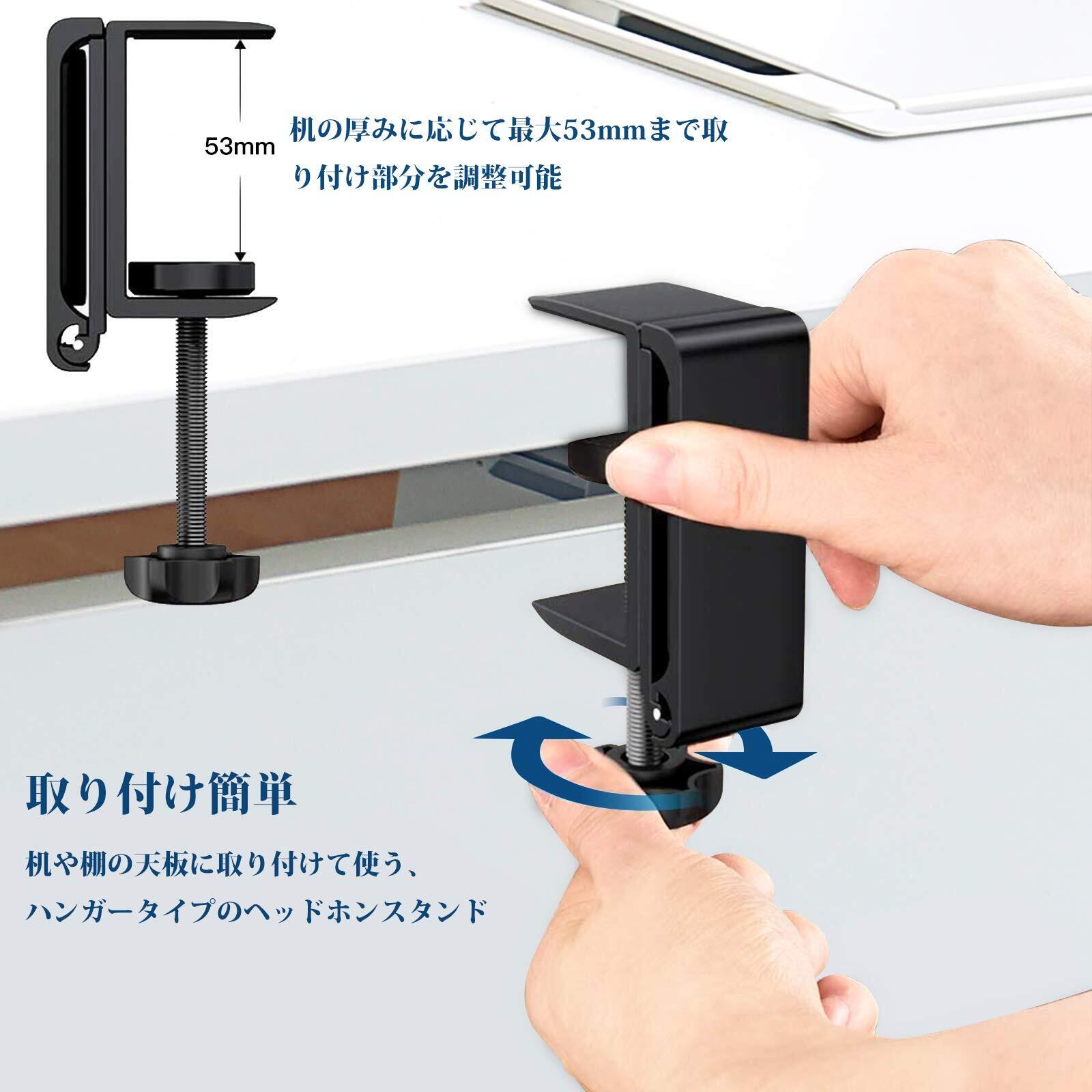 取り付け簡単:調節可能なノブは、簡単に回転させて固定することができ、接着剤は不要で、取り付け、取り外し、または移動が簡単。クランプを机に挟むだけなのですが、きっちり固定できます。スタンド式のホルダーではかけられない高さのあるヘッドホンでも簡単に設置することができます。