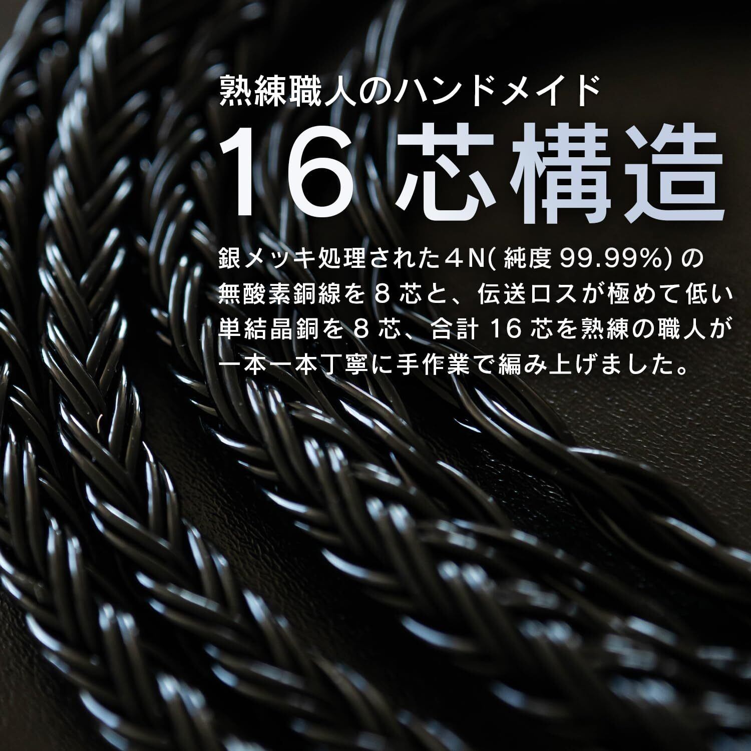 【8x8 合計16芯構造の高音質設計】高純度単結晶銅を8芯、銀メッキされた無酸素銅を8芯を熟練技師による手作業で丁寧に編み上げた16芯構造で、クラスを超えた音質を実現しました。