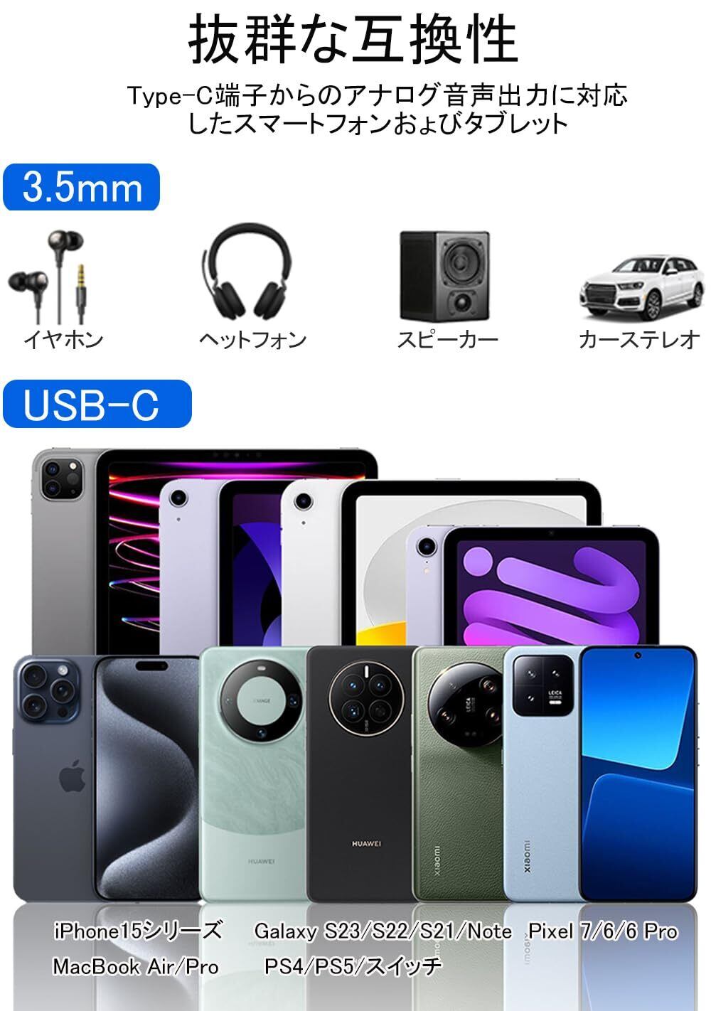 【購入前の注意事項】①.すべての機器での動作をするものではありません。実際の動作はご使用になるイヤホンおよび機種に依存します。(市場に出回っている携帯電話の機種やヘッドセットの機種が非常に多く、また更新が続いているため、各携帯電話と本製品の相性について詳しく説明することができませんので、ご了承ください。 万が一、商品をお受け取りになり、ご使用いただけない場合は、返品返金手続きをさせていただきますので、までご連絡ください。)②.USB-Cポートからの音声出力に対応していない機種では、本製品をご利用頂けませんのでご注意ください。③.モノラルイヤホンには対応していません。④.Bose Quiet Comfort20、BoseQuiet Comfort25、モノラルイヤホンには対応できないことをご了承ください。⑤. 3極(TRS)のイヤホンに接続する場合は、マイク機能に非対応。