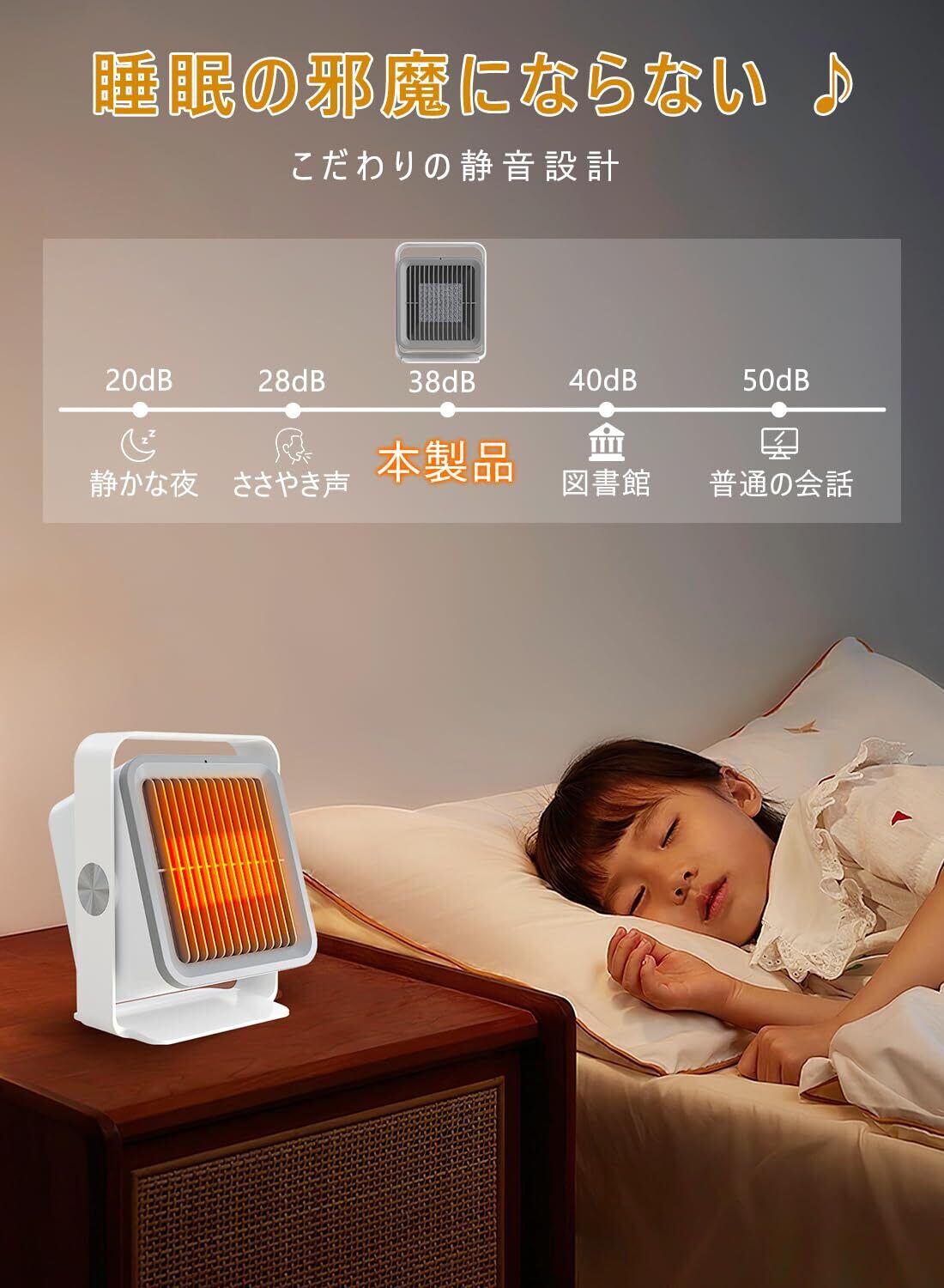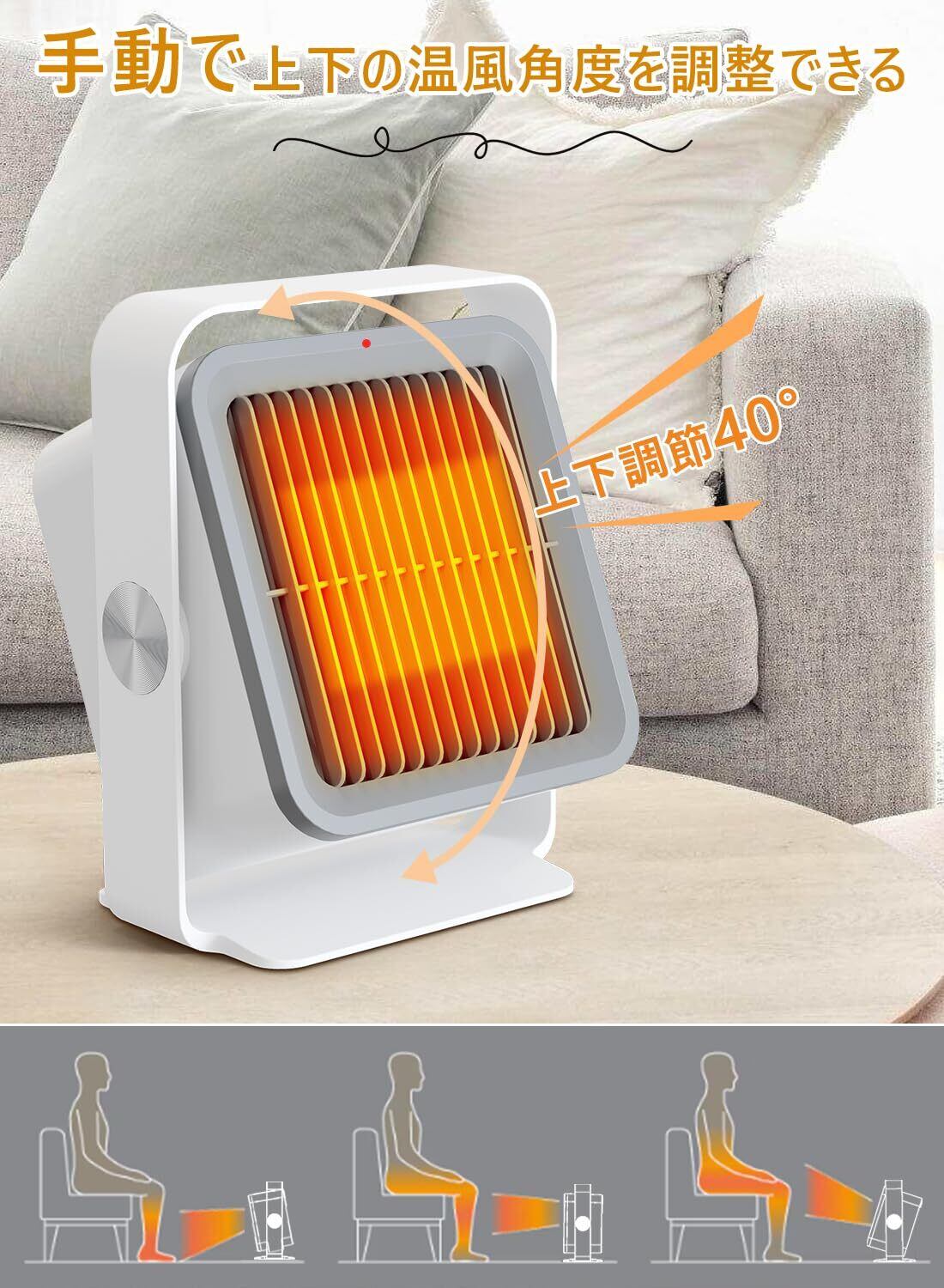 【温風角度調整可能&静音設計】ミニヒーターの送風角度を手動で調整可能、シーンに合わせて風向きを変えられるので使い勝手抜群です。稼働音はわずか38dBと静かで、睡眠中や勉強・仕事の邪魔になりません
