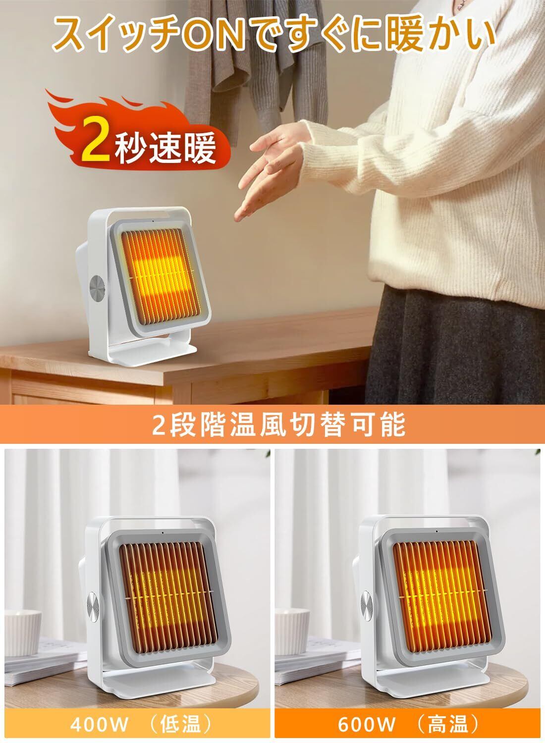 【2秒速暖・2段階温風ヒーター】電気式ヒーターなので、電源が入るスイッチを入れると約2秒で温風が出る即暖タイプ。400W(弱)と600W(強)の2段階モードを搭載しており、気温や使用環境に合わせて快適に調整できます