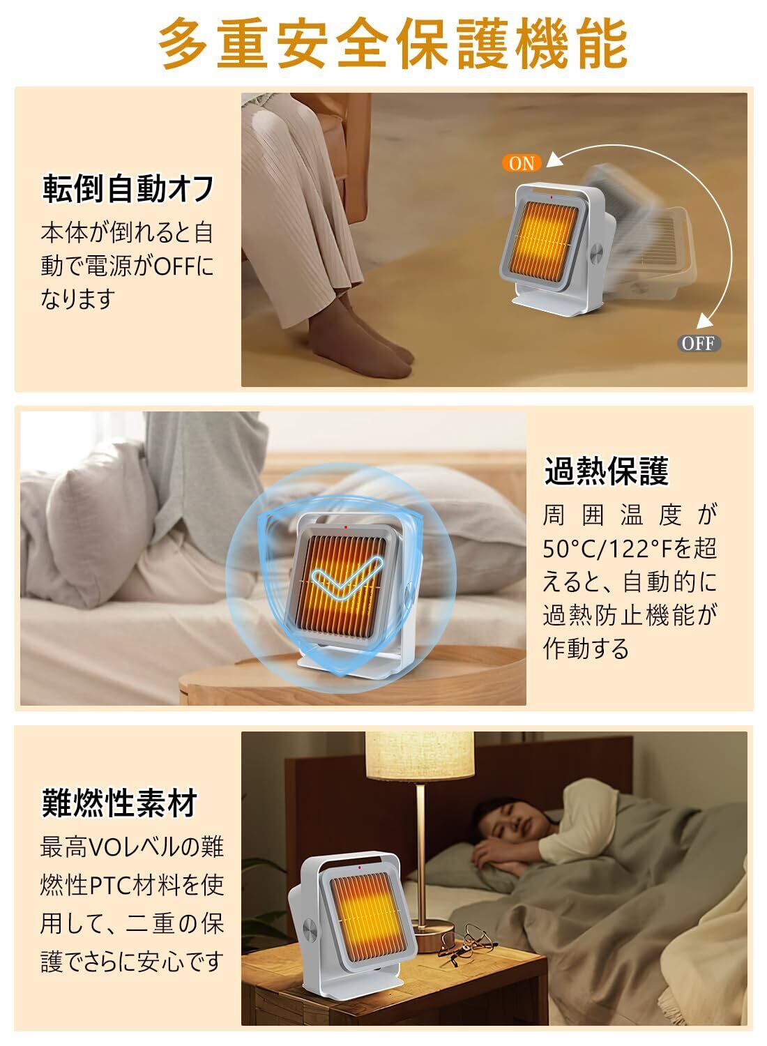 【安心安全設計】本ヒーターが転倒時は自動で電源が切れる転倒オフ機能を搭載。地震や衝突で倒れても安心です。また、過熱防止機能とV0級難燃素材を採用し、三重の安全対策で安心してご使用いただけます