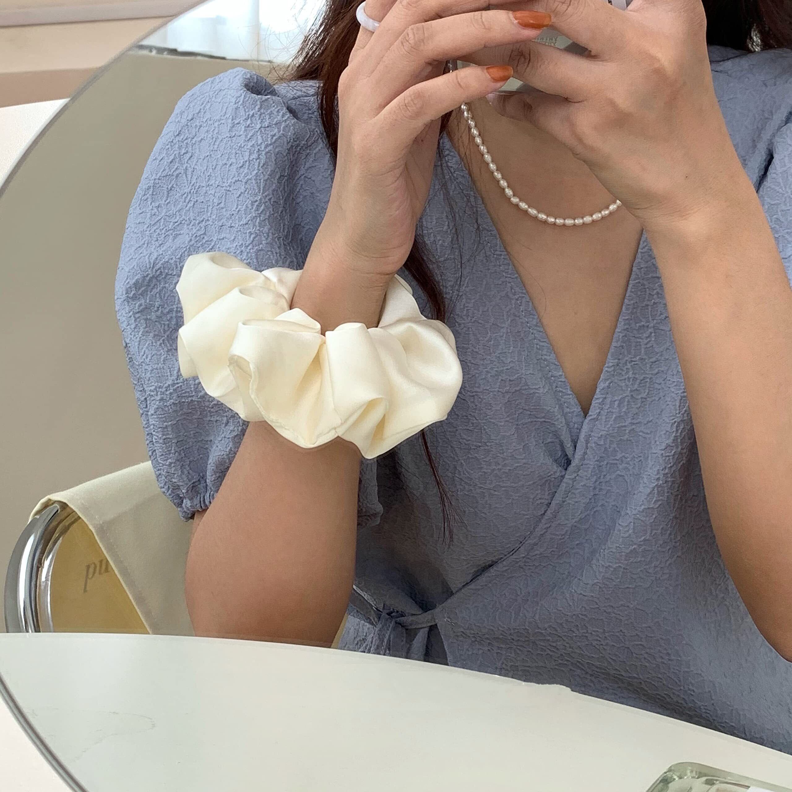 【いろいろなシーンで】ポニーテールやお団子ヘアの仕上げに使うのはもちろん、チャームのようにバッグにつけたり、手首に巻いてブレスレット替わりに使ったりするのもok。シンプルなのに華やかなので仕事や、お出かけ、おうちでのリラックス時に、毎日愛用して下さい!