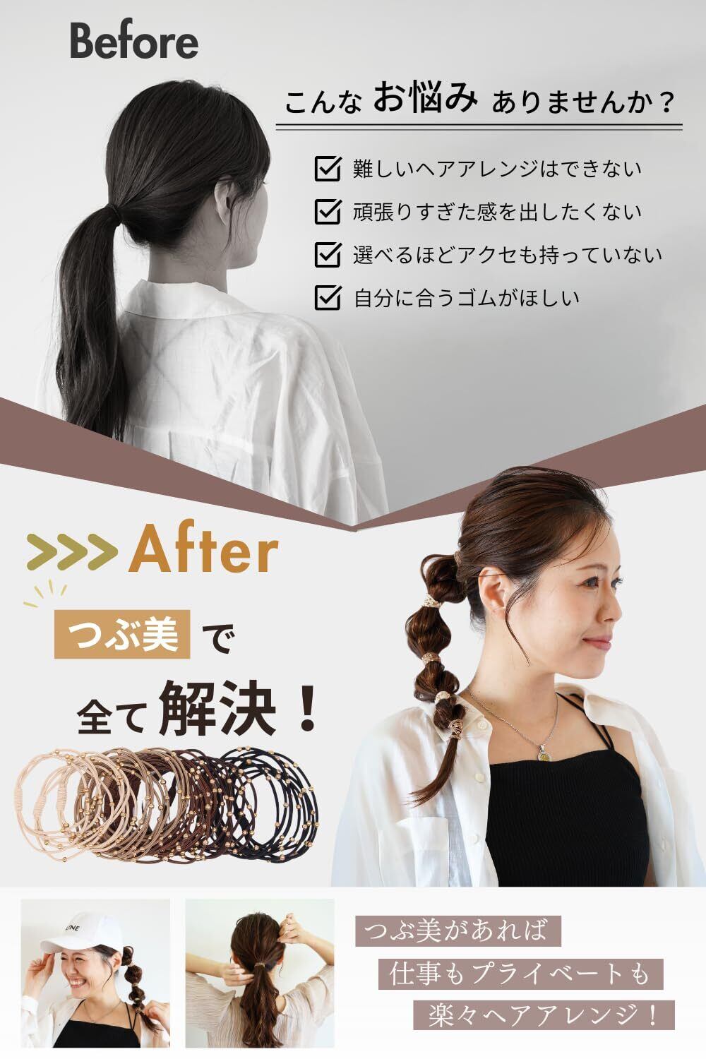 【まるでアクセサリーのようなヘアゴム】 さりげないアクセサリー感覚で華を添える「つぶ美」。シンプルながらも小さなつぶつぶが上品にきらめき、結ぶだけで手軽におしゃれを楽しめます。