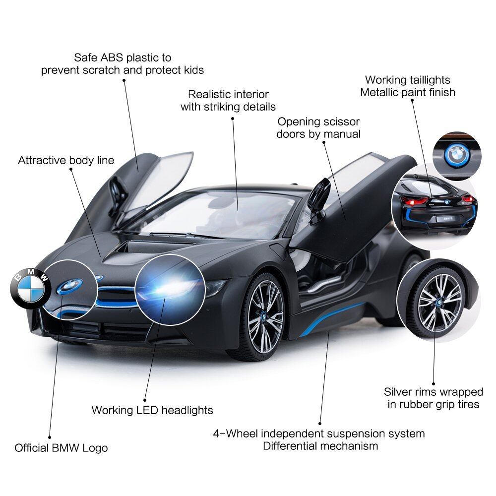 RASTAR BMW ラジコンカー、1/14 BMW i8 R/Cモデルカー、子供向け、コントローラーで左右のドアが自動開閉、黒メタリック塗装仕上げ、ブラック・黒