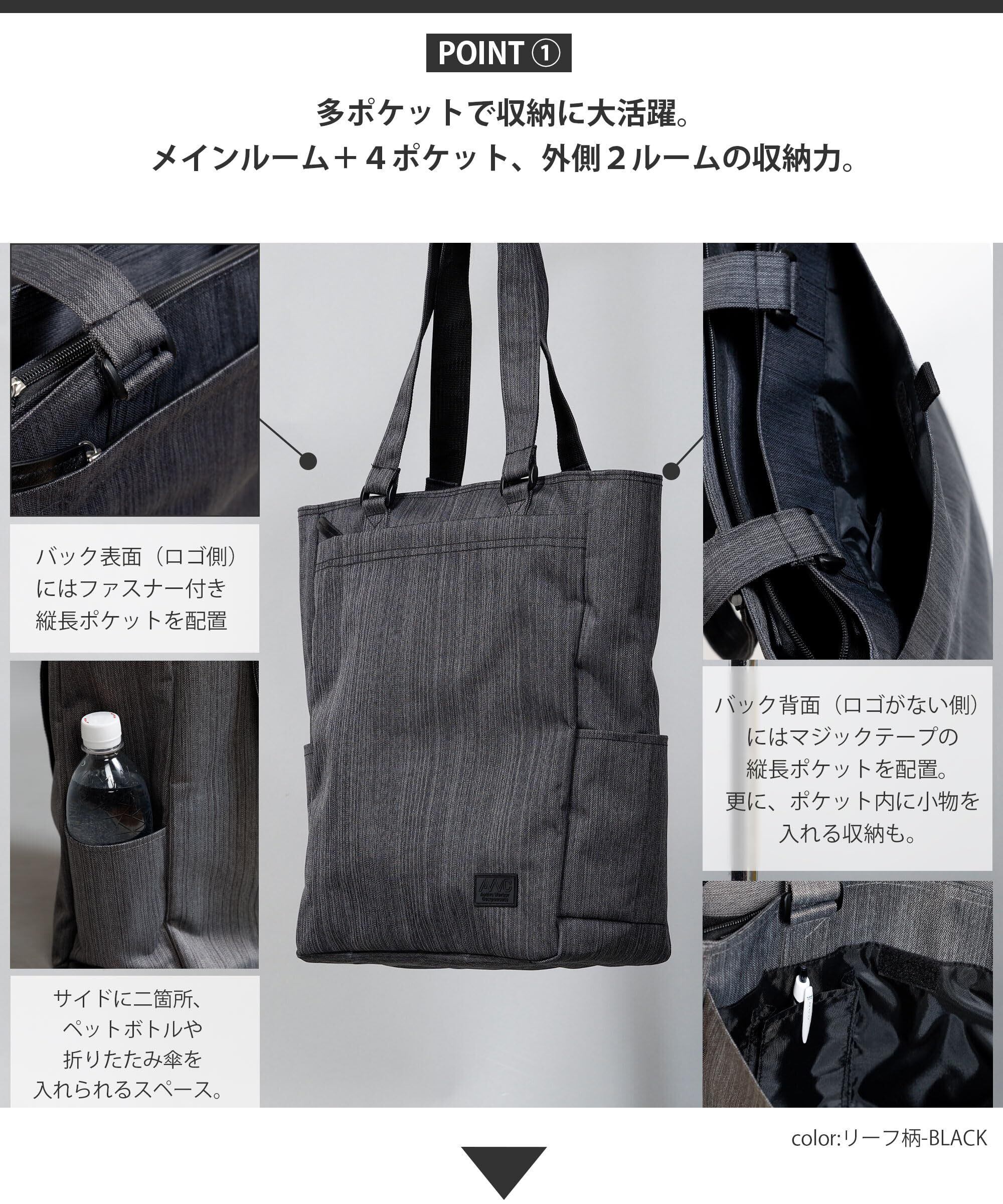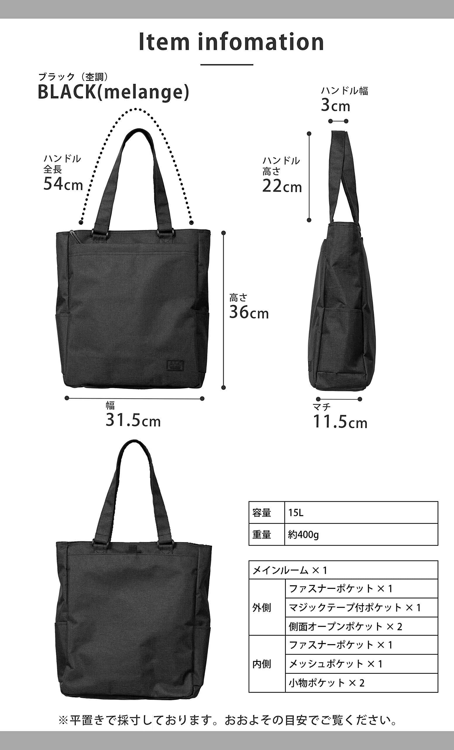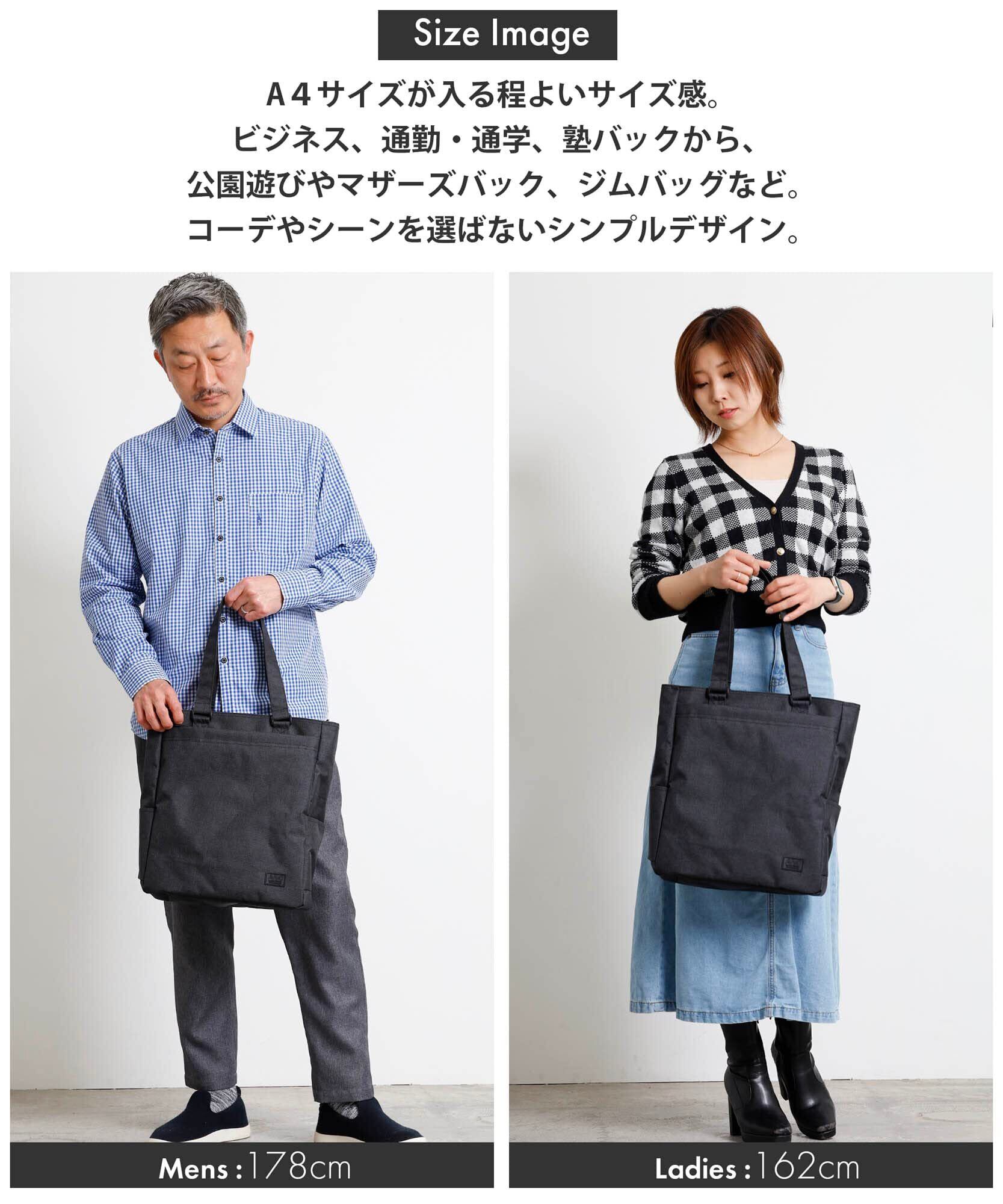 シンプル! 大容量!バツグンの使いやすさのトートバッグが登場です。ベーシックデザインのシンプルなトートバッグです。余分な装飾を省いた、ユーティリティー重視の使えるバッグ!ハンドルの長さは25cmで肩掛けしやすいサイズ感。本体入り口はZIP開閉式なので安心です。両サイドにはペットボトルや折りたたみ傘入れにも使えるサブポケット付き。表面・裏面ともに、外面はA4サイズが入るポケット仕様となっております。内側にはオープンポケット・ZIPつきポケットと、マジックテープ式のメッシュポケットで小さなものも小分けして収納できます。普段づかいはもちろん、通勤・通学にもぴったり。カジュアルにもビジネスにも使える定番アイテムです!
