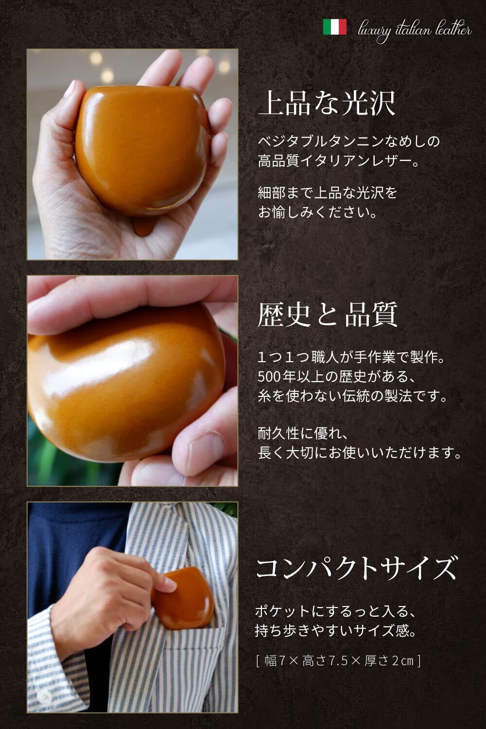 【イタリアンレザー(ベジタブルタンニン鞣し)】 艶が楽しめるイタリアンレザーは滑らかな手触りと確かな品質で世界中から人気のあるベジタブルタンニン鞣し革です。温かみのある風合い、柔らかな触り心地、高い耐久性などが特徴で、時間をかけてゆっくりと鞣すことで高級感のある上質な革へと仕上がります。