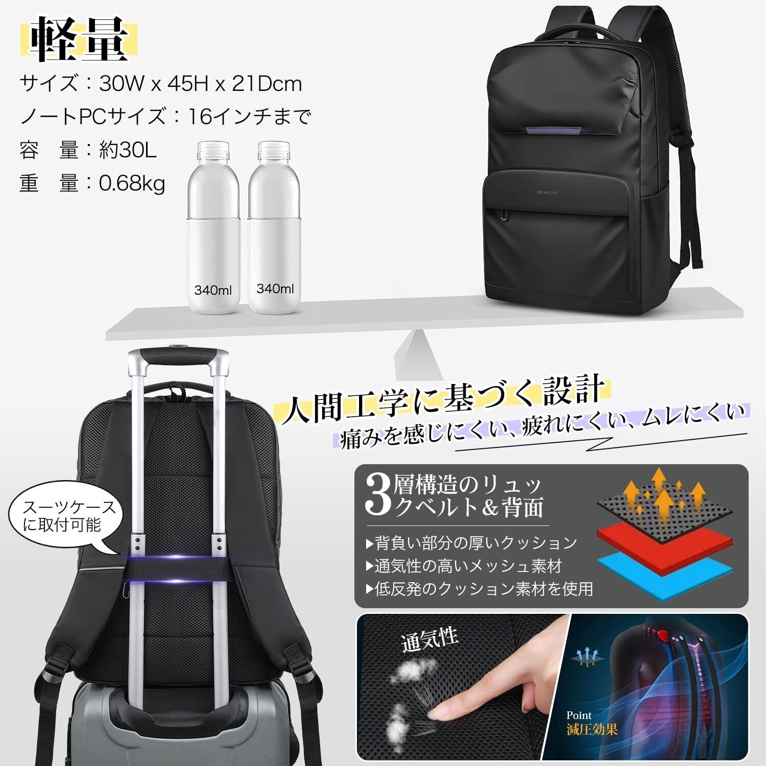 【数量限定】[BUKKUUE] リュック メンズ 大容量 ビジネスリュック 防水 リュックサック バックパック PCリュック 旅行 防災 通勤