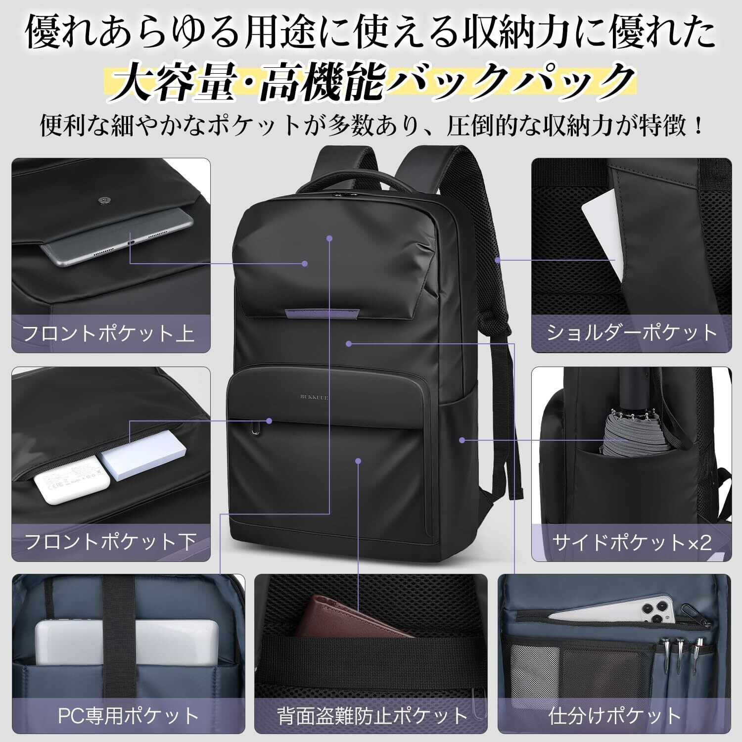 【多機能ポケットで収納力抜群の大容量リュックサック】ビジネスシーンでは書類や電子アクセサリー類など、小物類や綺麗に保って持ち運びたい荷物も多くあるため、ポケットの数も非常に重要になってきます。「BUKKUUE」のリュックサックは合計15個ものポケットが付いているので、整理整頓が苦手な方でも綺麗に使うことができます。マチ幅も広いため嵩張る荷物やお弁当・水筒・着替え・A4サイズの書類などの収納も楽に行えます。