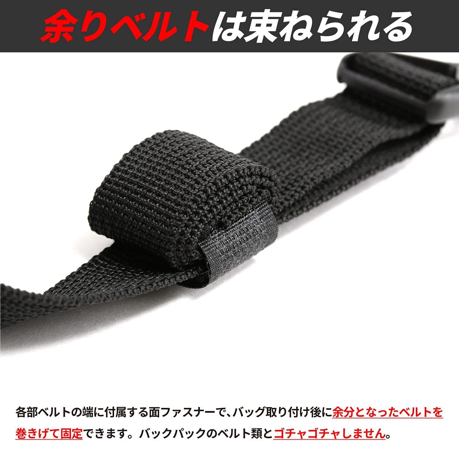 各部ベルトの端に付属する面ファスナーを活用すれば、バッグ取り付け後に余ったベルトをまとめて固定できます。