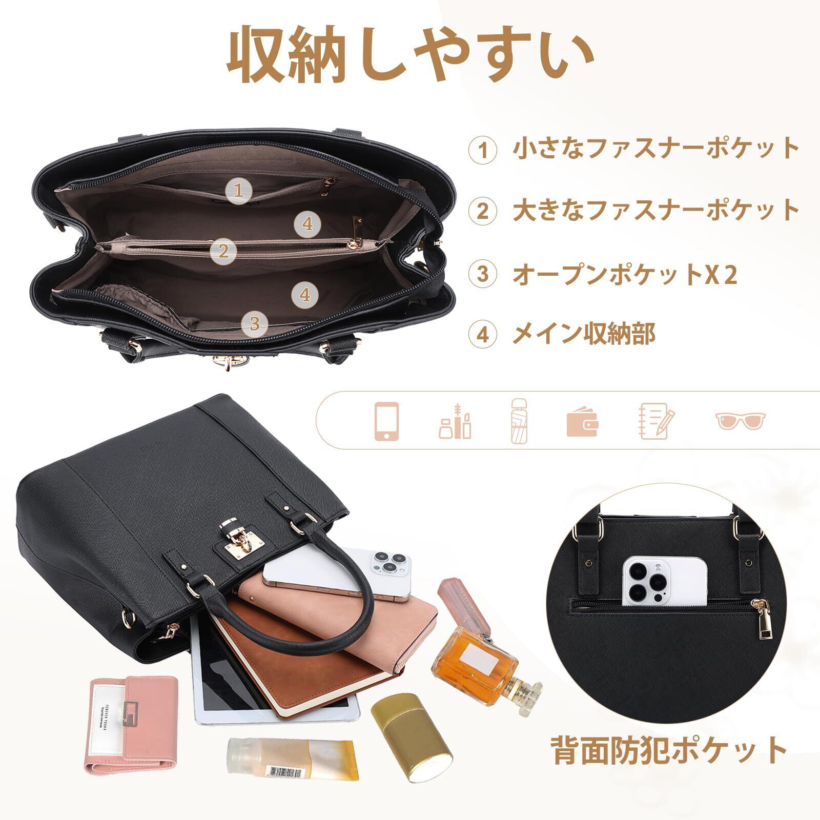 √実用な容量:このトートバッグは見た目以上の収納力と機能性があります。メイン収納部2つ、ファスナーポケット2つ、オープンポッケト2つがあります。メイン収納部に11インチタブレットを収納でき、更に複数ポケットとキーボルターがあり、手帳、スマート、長財布、化粧品、鍵など仕切りがあるので小物をきれいに分類して入れられます。背面に盗難防止用のポケットがあるため、貴重品はここに入れておくこともできます。