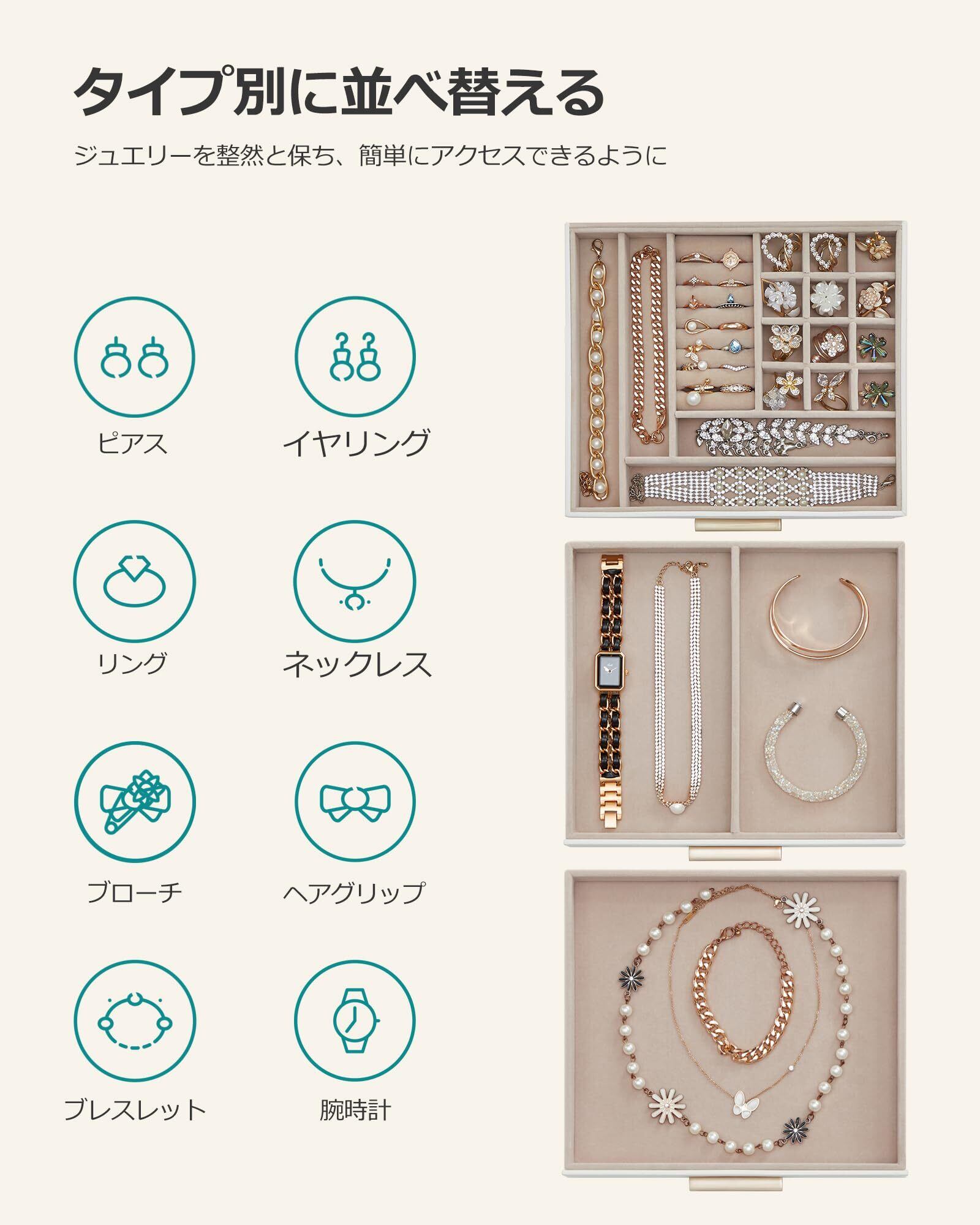 【人気商品】SONGMICS ジュエリーボックス 大容量 アクセサリーケース 3段式 引き出し ネックレス、指輪、ブレスレット収納宝石箱 ガラス蓋 ギフト ホワイト JBC239WT
