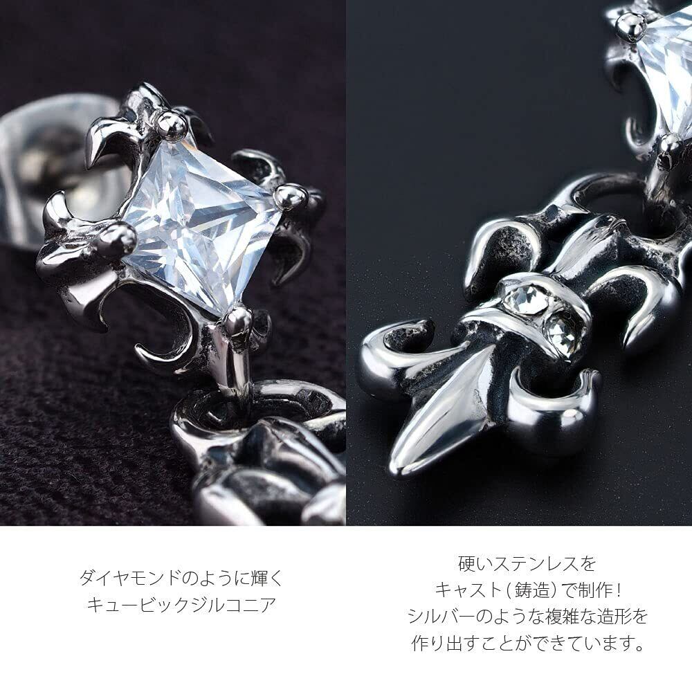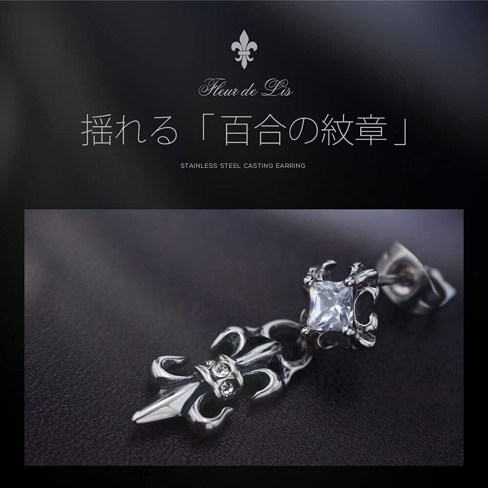 百合の紋章をモチーフにしたステンレス製のドロップピアスです。百合の紋章型の爪で留めたスクエアジルコニアに、さらに百合の紋章がぶら下がるデザインです。