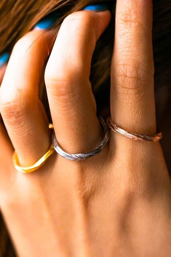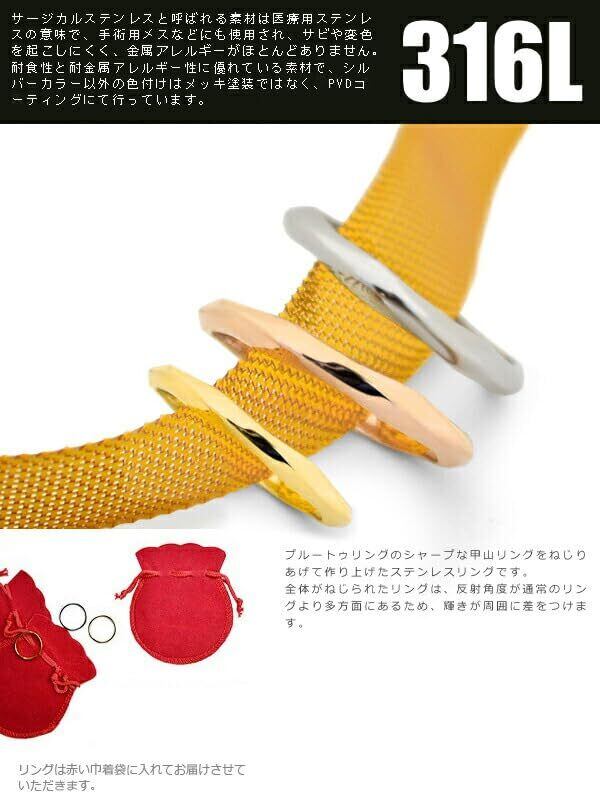 プルートゥリングのシャープな甲山リングをねじりあげて作り上げたステンレスリングです。全体がねじられたリングは、反射角度が通常のリングより多方面にあるため、輝きが周囲に差をつけます。