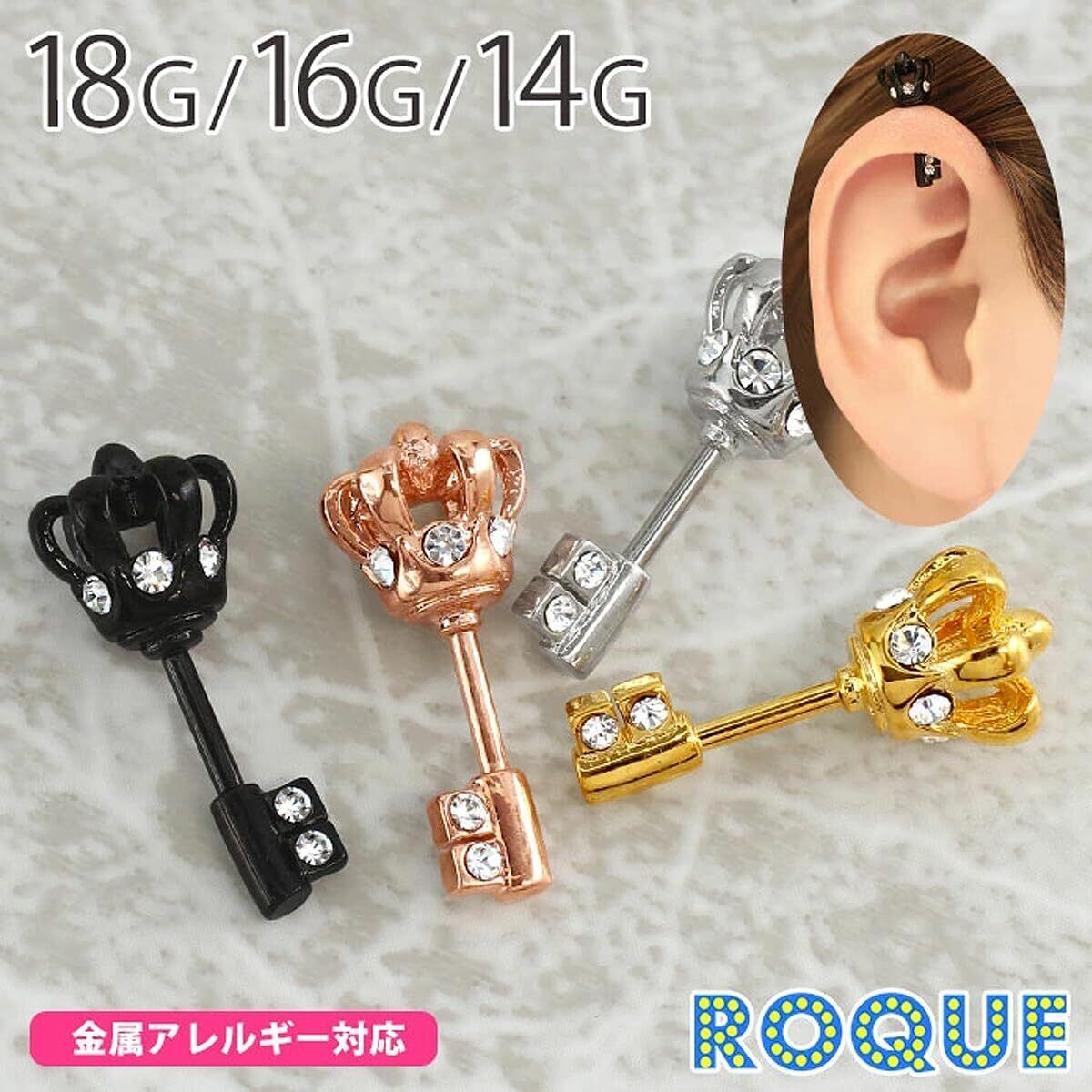 [ROQUE] ボディピアス 18G 16G 14G ジュエル付きクラウントップ ストレートバーベル(1個売り)