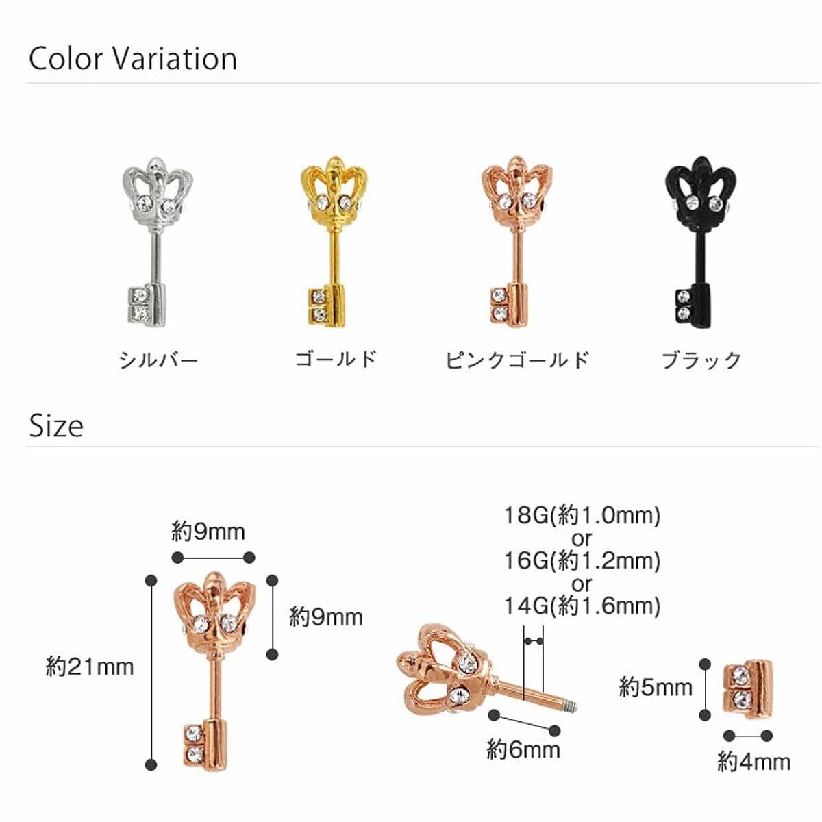 鍵が耳を貫通しているように見えるクラウントップのキーモチーフバーベル! モチーフ・キャッチに埋め込まれたジュエルがアクセント。