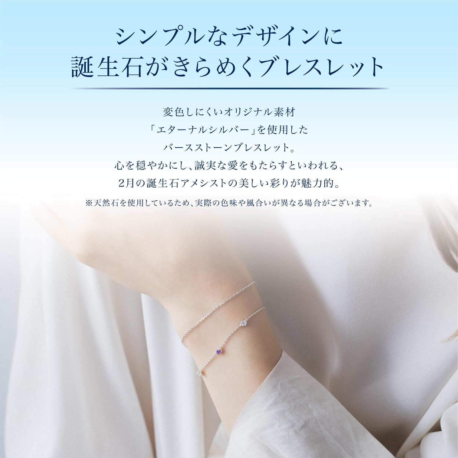 変色しにくいオリジナル素材「エターナルシルバー」を使用したブレスレット。2月の誕生石のアメシストと、キュービックジルコニアが華やかさを添える、爽やかで上品な印象のデザイン。ほどよいボリュームの2連のチェーンが女性らしい華奢な手元に。※天然石を使用しているため、実際の色味や風合いが異なる場合がございます。