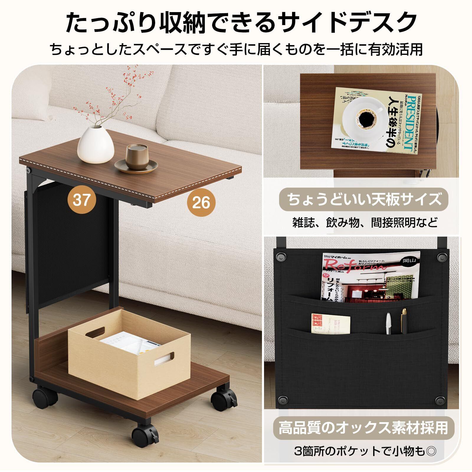 【新着商品】サイドテーブル キャスター付き ナイトテーブル サイドテーブル ベッド横 おしゃれ 幅37×奥行26×高さ54cm アジャスター付き コの字 移動便利 ソファ スリム 小型 (ウォールナット)