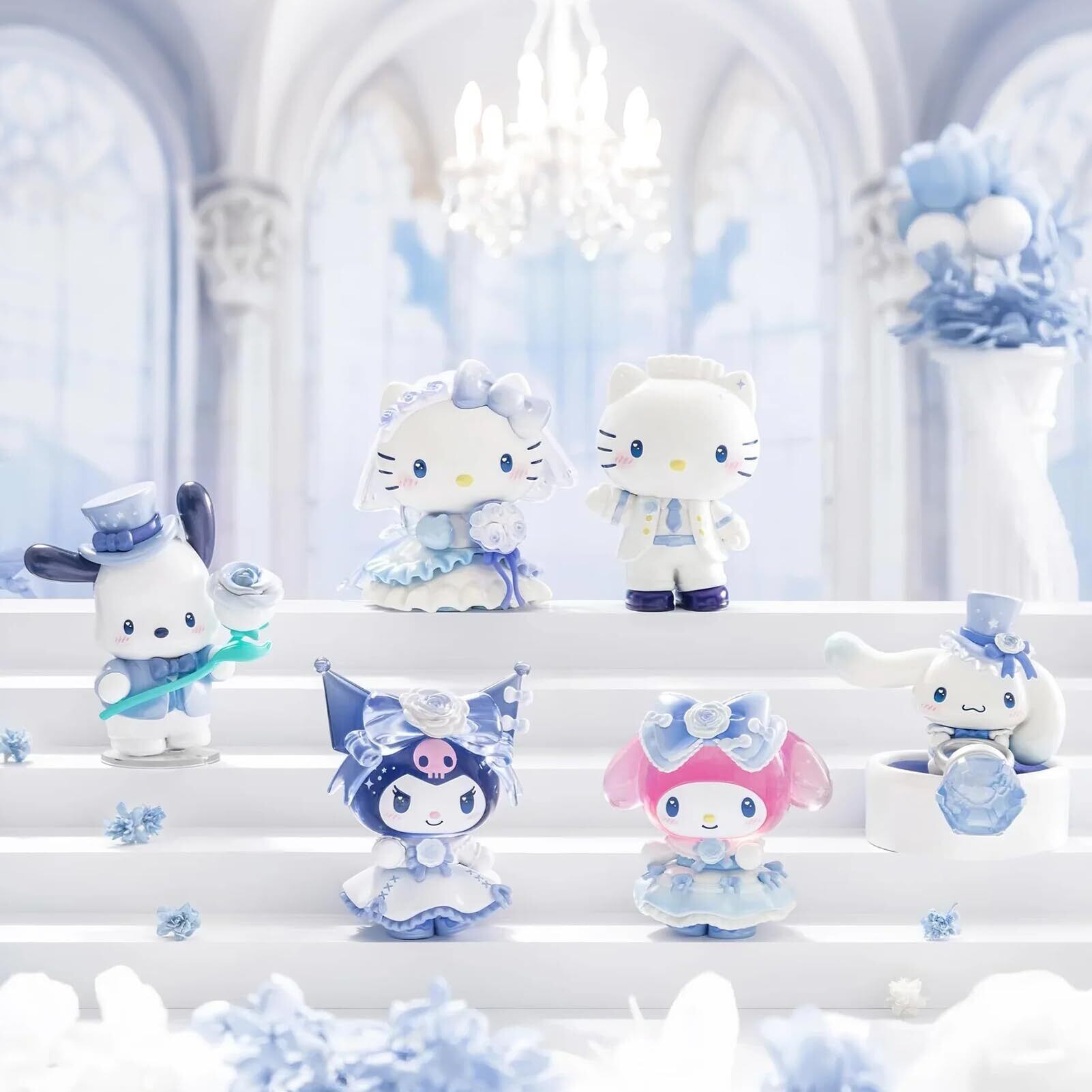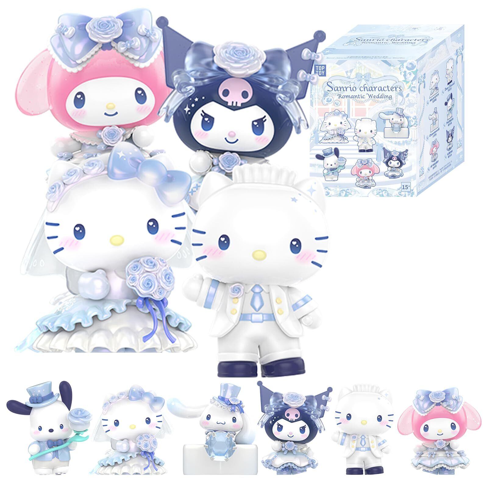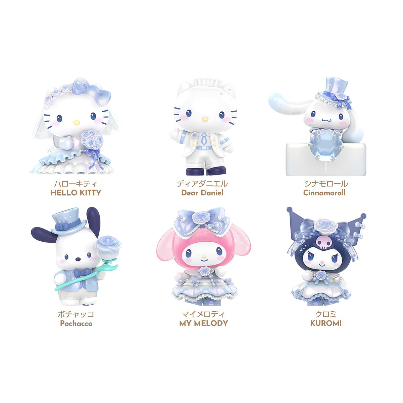 【TOP TOY × サンリオが贈る、ロマンティック・ウェディングシリーズ】サンリオ(SANRIO)の人気キャラクター、キティ、マイメロディ、クロミたちが華やかなウェディングスタイルで登場。ブルーとホワイトを基調にしたドレスやタキシードに身を包み、愛と祝福に包まれた夢のようなフィギュアコレクションです。