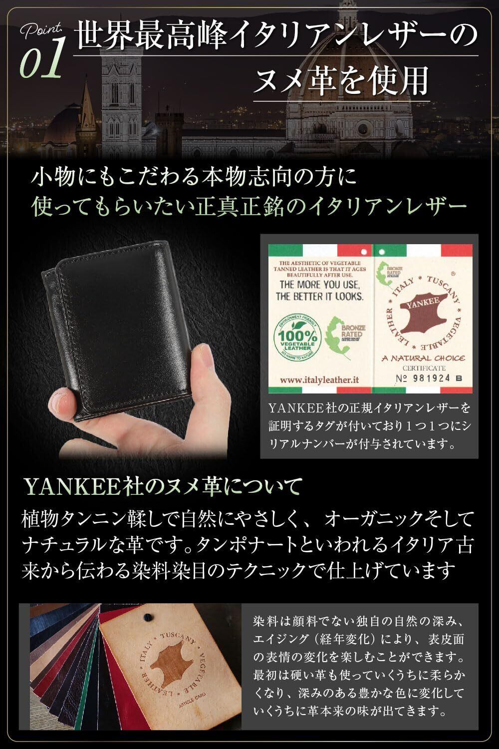 【YANKEE社のヌメ革について】植物タンニン鞣しで自然に優しく、オーガニックそしてナチュラルな革です。タンポナートと言われるイタリア古来から伝わる染料染目のテクニックで仕上げています。