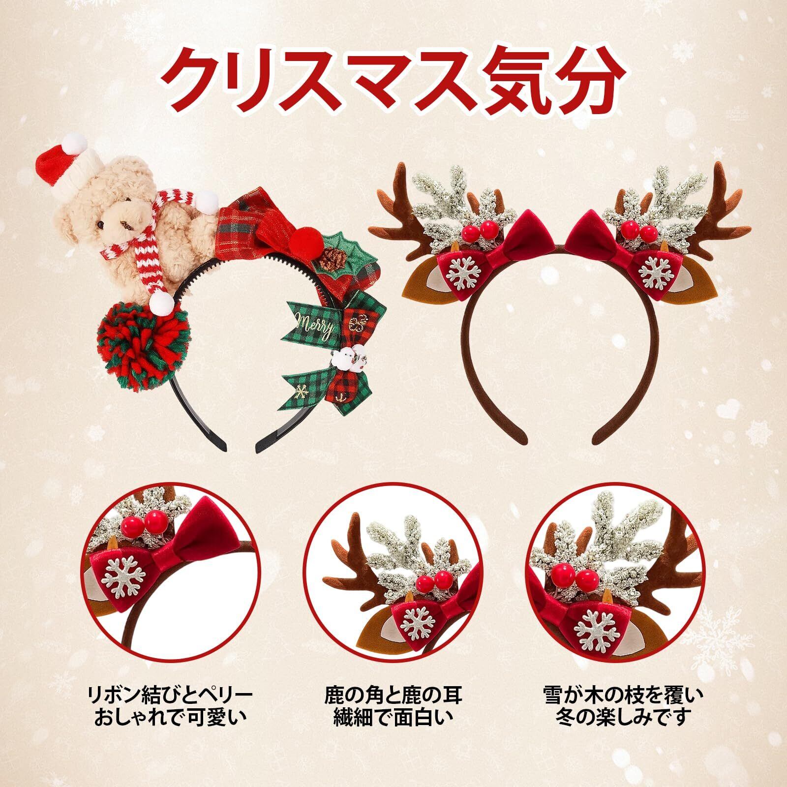 クマカチューシャはかわいいクマの耳デザインで、子供から大人まで人気があります。トナカイカチューシャはリアルな鹿角デザインで、クリスマスパーティーやイベントに最適です。どちらもクリスマスリボンが付属しており、さらに華やかな印象を与えます。