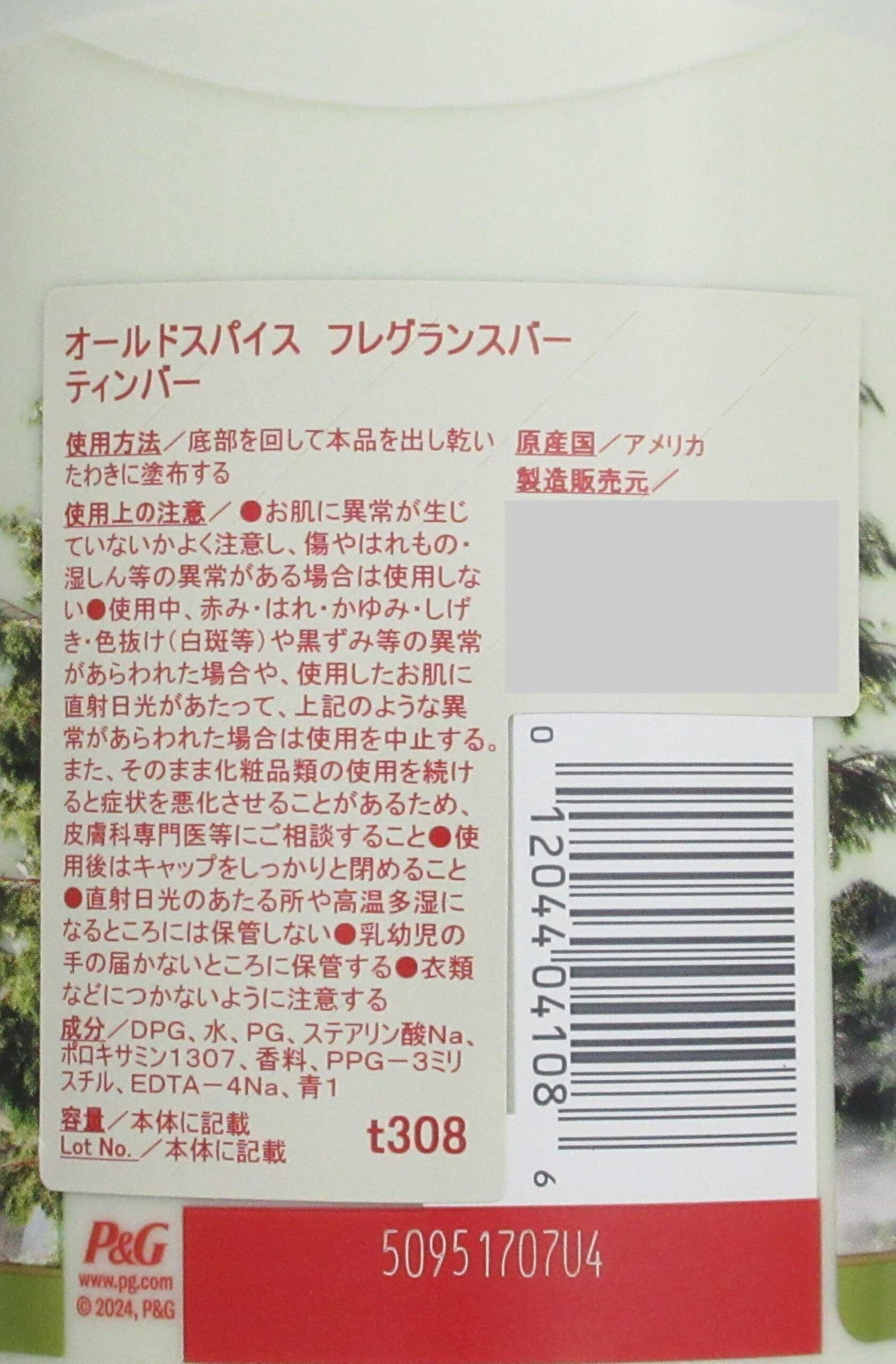 セット内容:OLD SPICE のフレグランスバーシリーズ「ティンバー(3oz/85g)」の2個セット。サンダルウッドとヒノキの香り。「アルミニウム/パラベン」不使用。