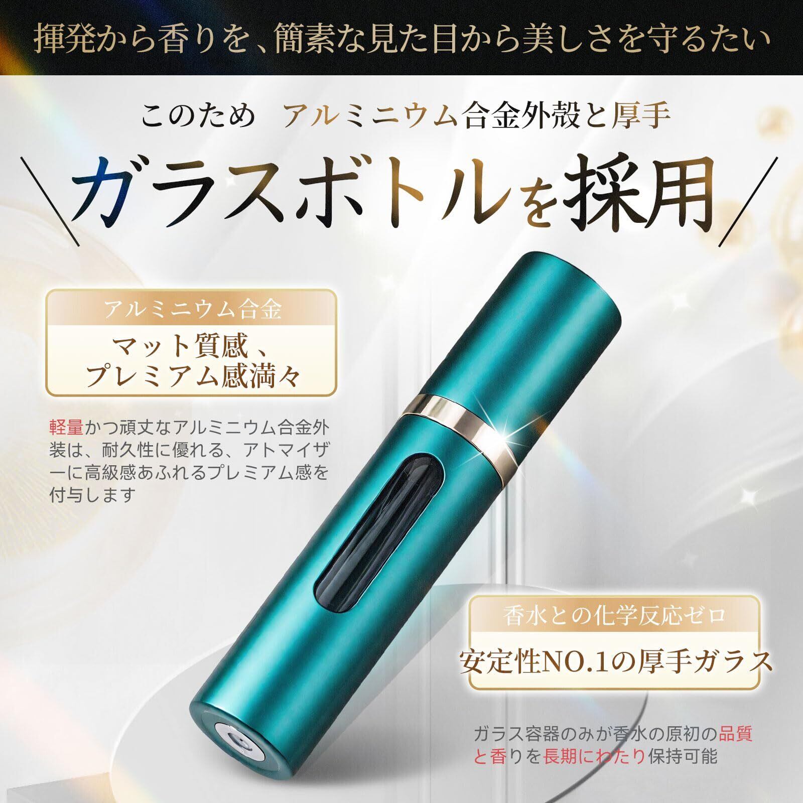 【高級アルミボディ&厚手ガラス内胆】高級口紅にも負けないデザイン性を備えています。外側のボディには高強度のアルミニウム合金を使用し、さらに高級感あふれるマット塗装を施しました。お手持ちの香水アトマイザーが、より一層高級で洗練された印象に! さらに、アルミニウム合金ボディは衝撃に強く、万一落としても安心です。内蔵のガラスボトルも厚手仕様を採用。うっかり落としても、ガラスが割れる心配は一切ありません!