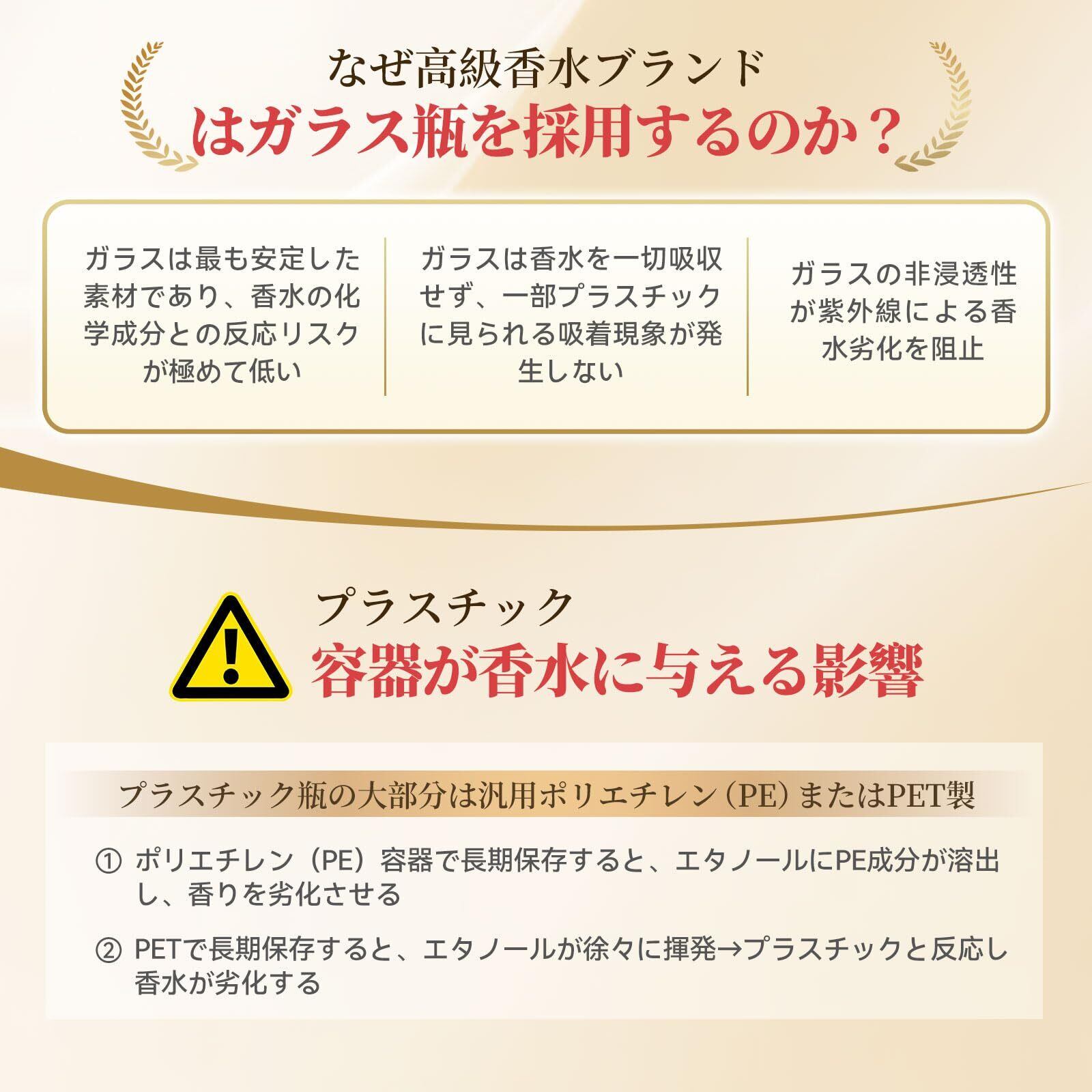 【漏れない!揮発しない!完璧な香水アトマイザー】蓋が外れて、高級香水がバッグの中に…? 密封性が悪くて、香水がじわじわ揮発してしまった…? ご安心ください。当社の香水アトマイザーは完全密封構造を採用します。蓋の閉まりをより強くし、外れにくい設計です。さらに高品質で厚手のガラスボトルを使用しているため、本当に漏れず、揮発しません! PCTG樹脂よりも高い耐熱温度を実現しているため、香りの変化や揮発量の減少も心配ありません!
