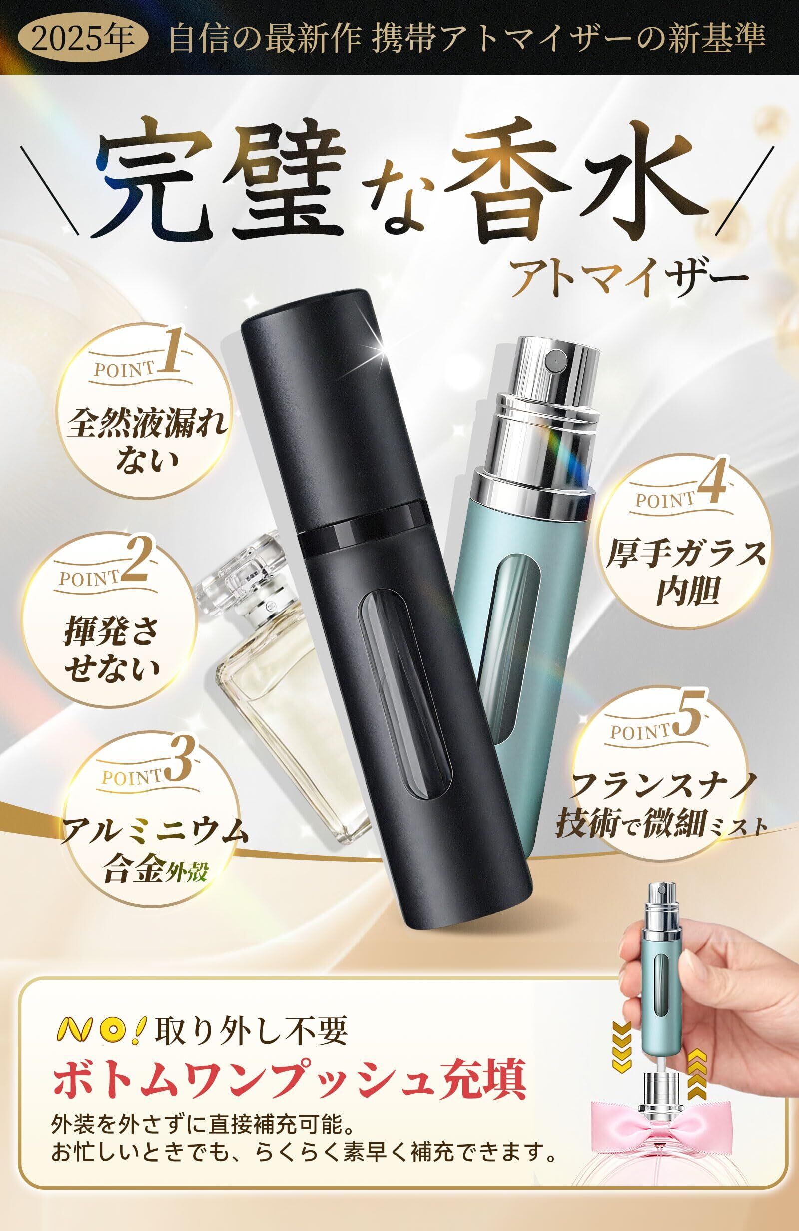 【ボトムワンプッシュ充填&残量確認可能!】香水の補充のたびにボトルを取り外す必要がありますか? 残量がわからず、使いたいときに空になっていて焦ったことはありませんか? ご心配なく。当社の香水アトマイザーは一体型構造を採用しているため、ボトルを分解する必要は一切ありません。ボトム(底部)から直接、ワンプッシュで簡単に香水を充填できます。さらに、ボディには残量確認用の窓付きデザインを採用。この窓から一目で香水の残量を簡単に確認でき、補充のタイミングがわかりやすく、いつでも香水を使える状態を保てます!