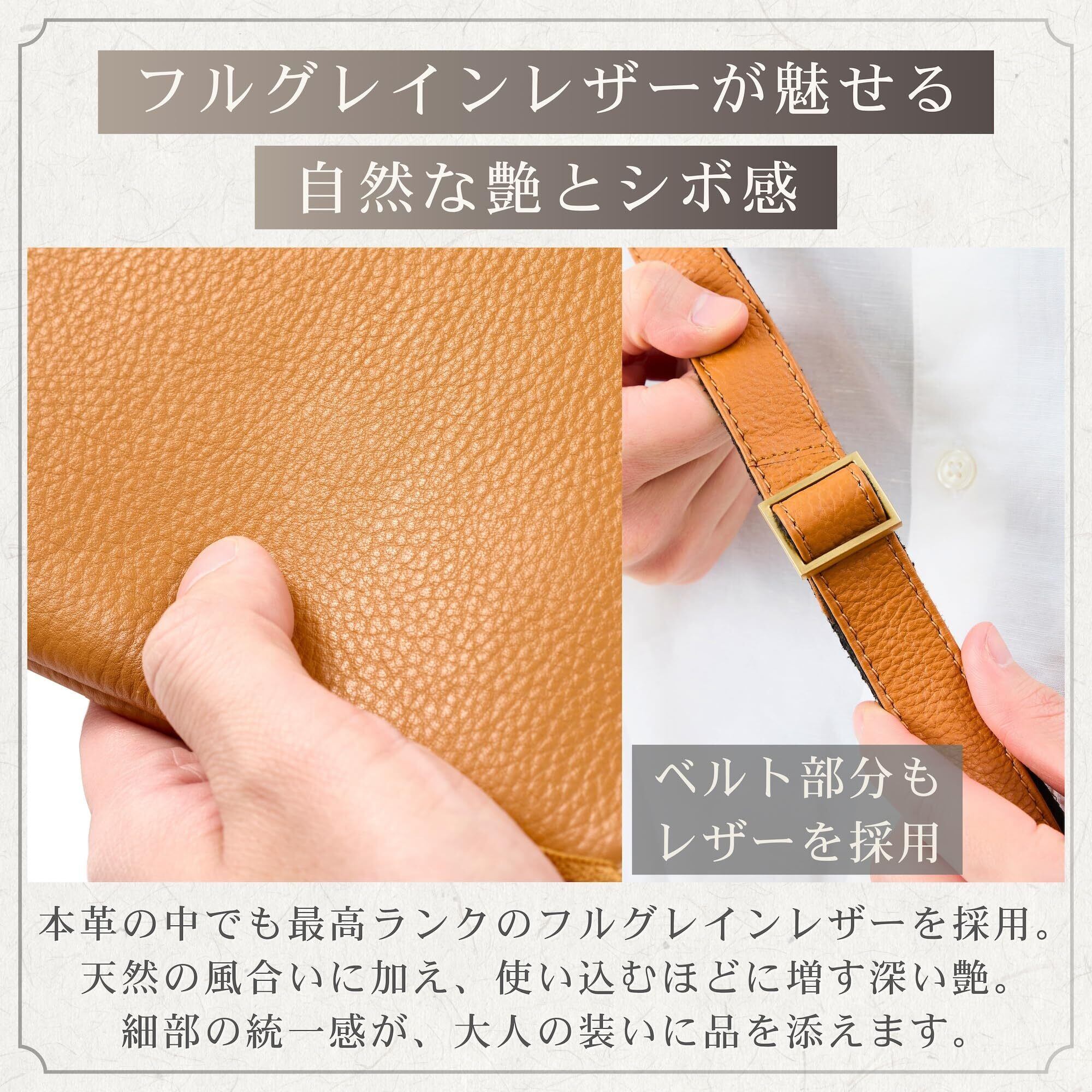 【上質素材】革の中でも高級ランクのフルグレインレザーを使用。柔らかな触感と耐久性を両立した本革サコッシュ。