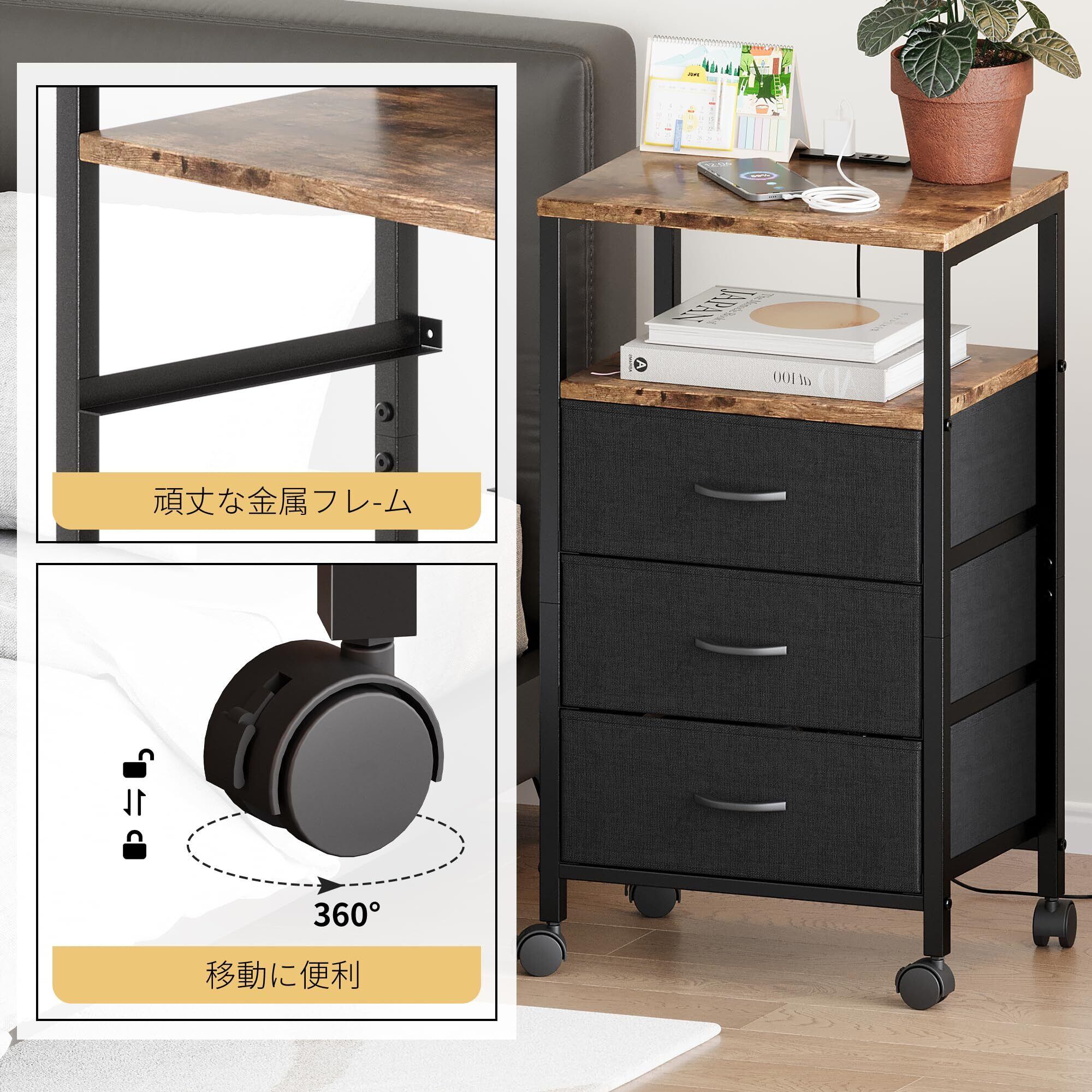 【2022最新】サイドテーブル キャスター付き ナイトテーブル 引き出し三つ付きのベッドサイド テーブル コンセント付き 可移動ナイトテーブル ベッド横 テーブル 北欧 洋服 タンス 天板付き (ビンテージ, 幅40×奥行30×高さ73cm)