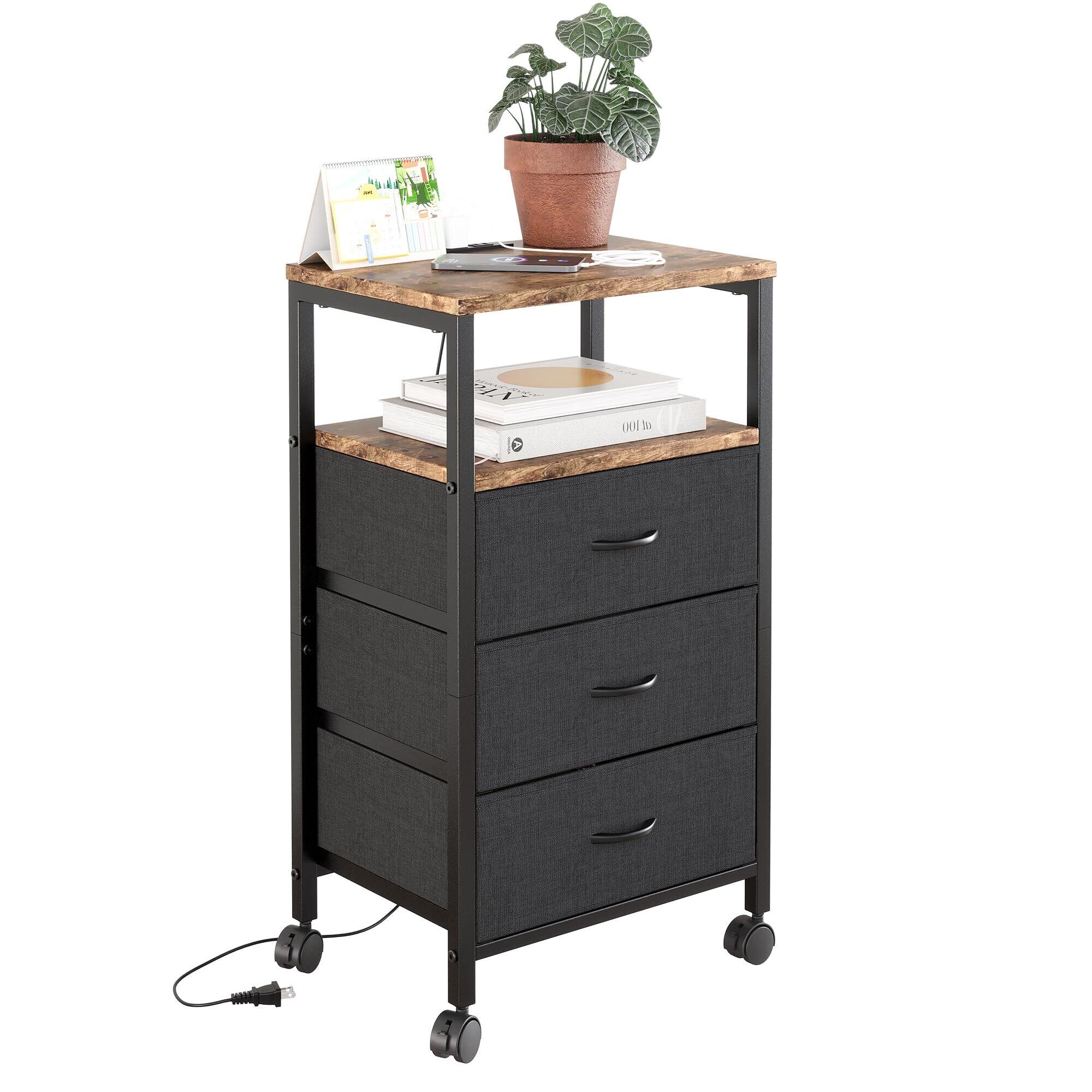 サイドテーブル キャスター付き ナイトテーブル 引き出し三つ付きのベッドサイド テーブル コンセント付き 可移動ナイトテーブル ベッド横 テーブル 北欧 洋服 タンス 天板付き (ビンテージ, 幅40×奥行30×高さ73cm)