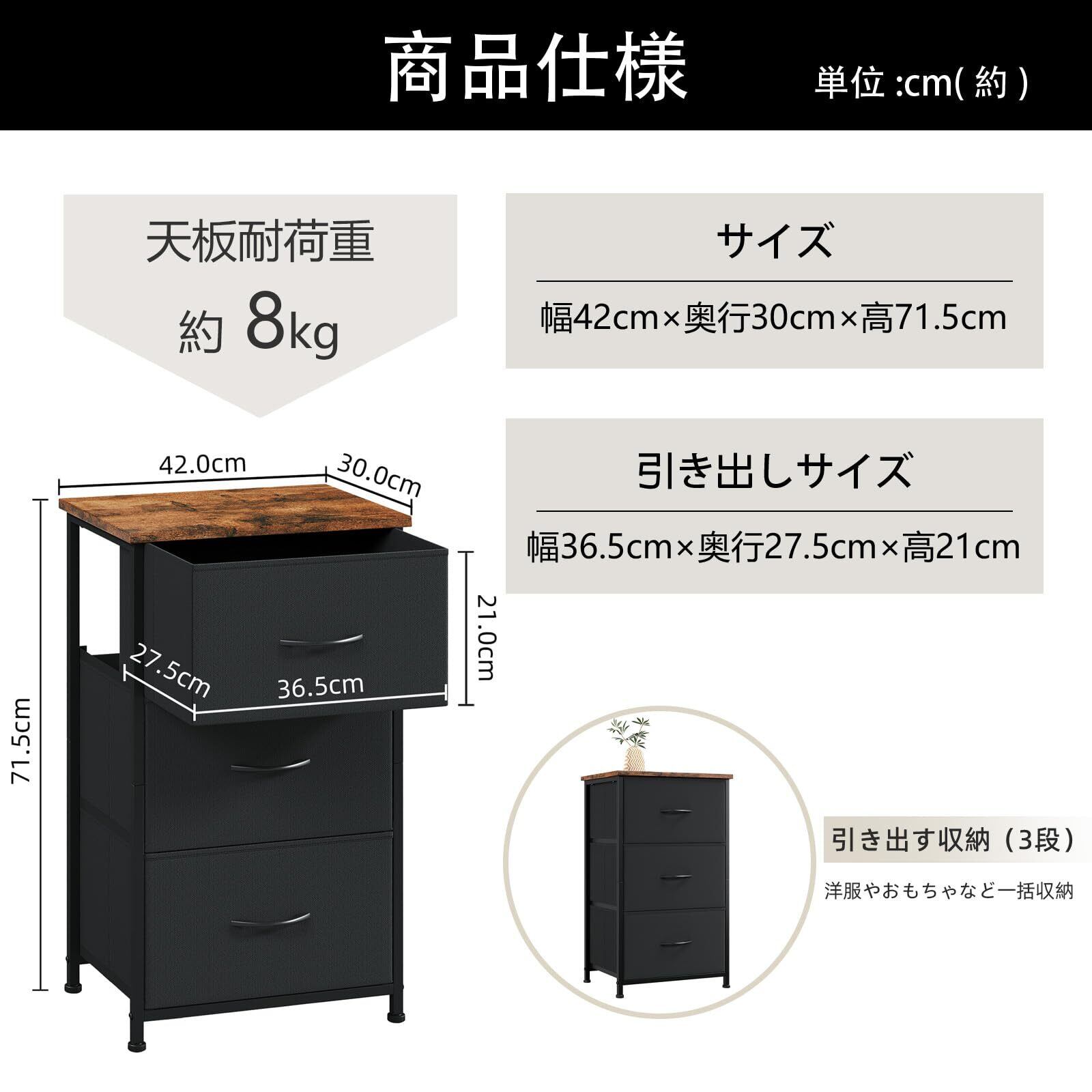 【おしゃれで部屋を彩る】シンプルかつ洗練されたデザインのため、どんな部屋でも馴染みます。三つの引き出しに分けるので、日常生活に便利に使えます。チェストの脚は調整できるので、平らでない地面にも調節できて、タンスのバランスを保てます。弊店のほかのサイズの収納チェストとの組み合わせがおすすめです。