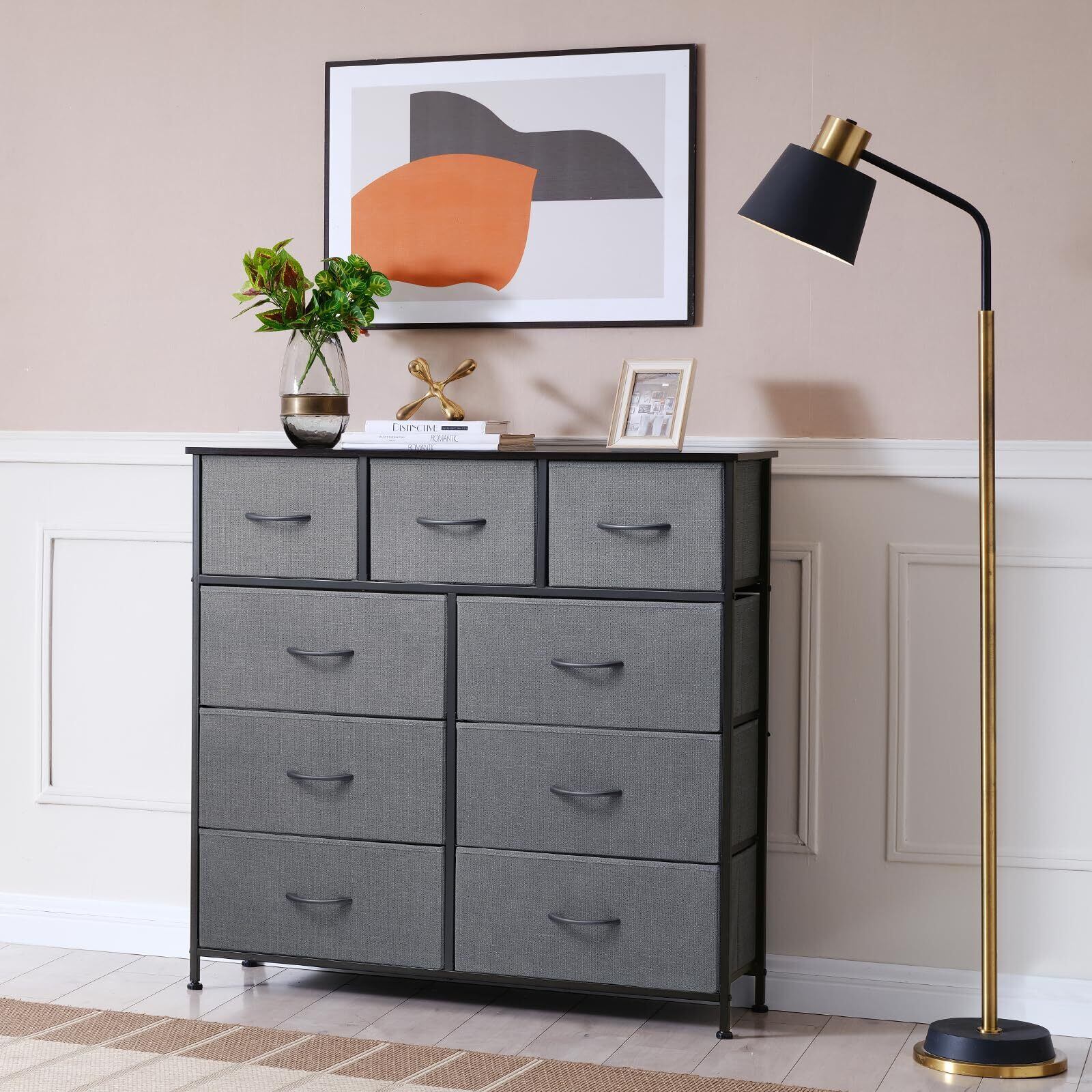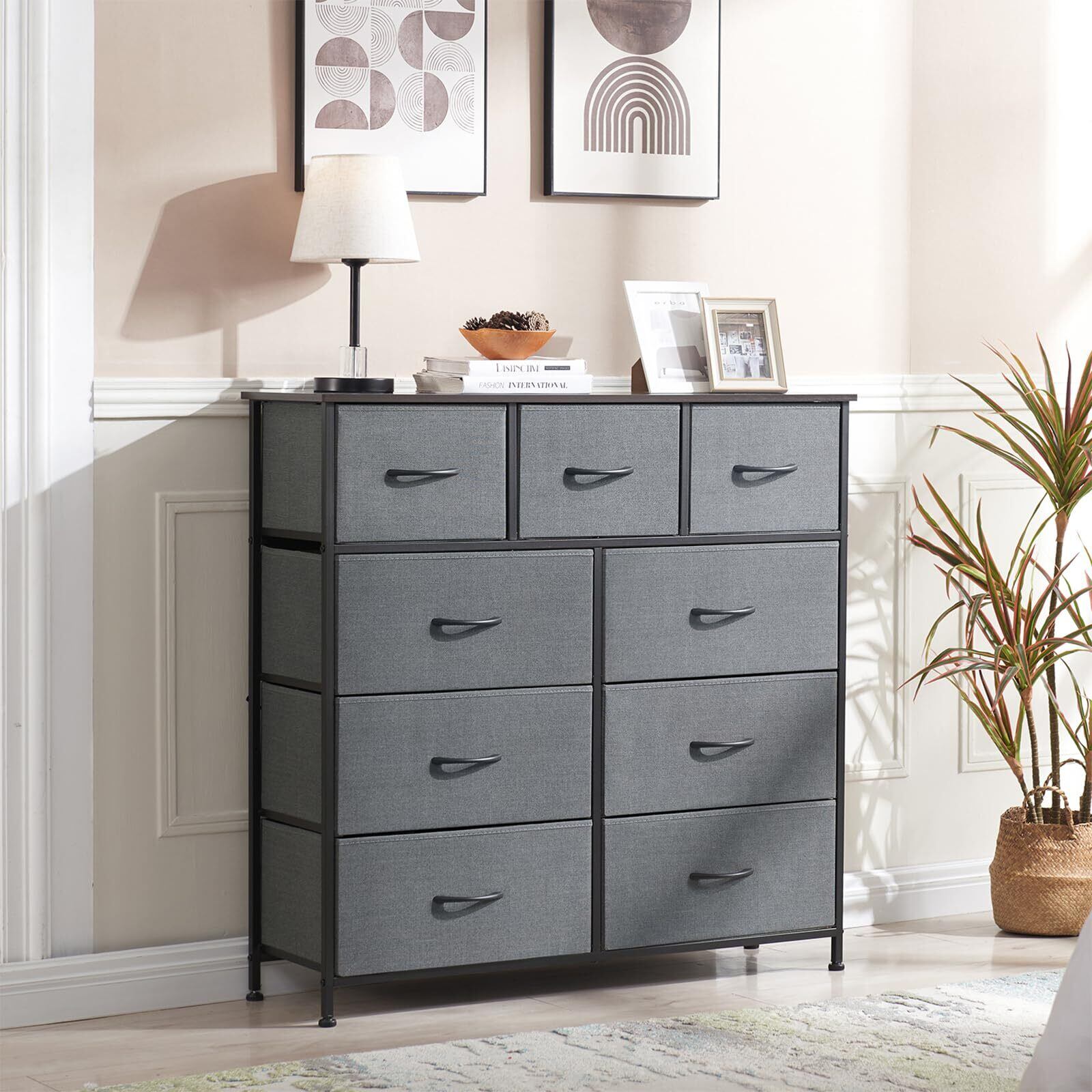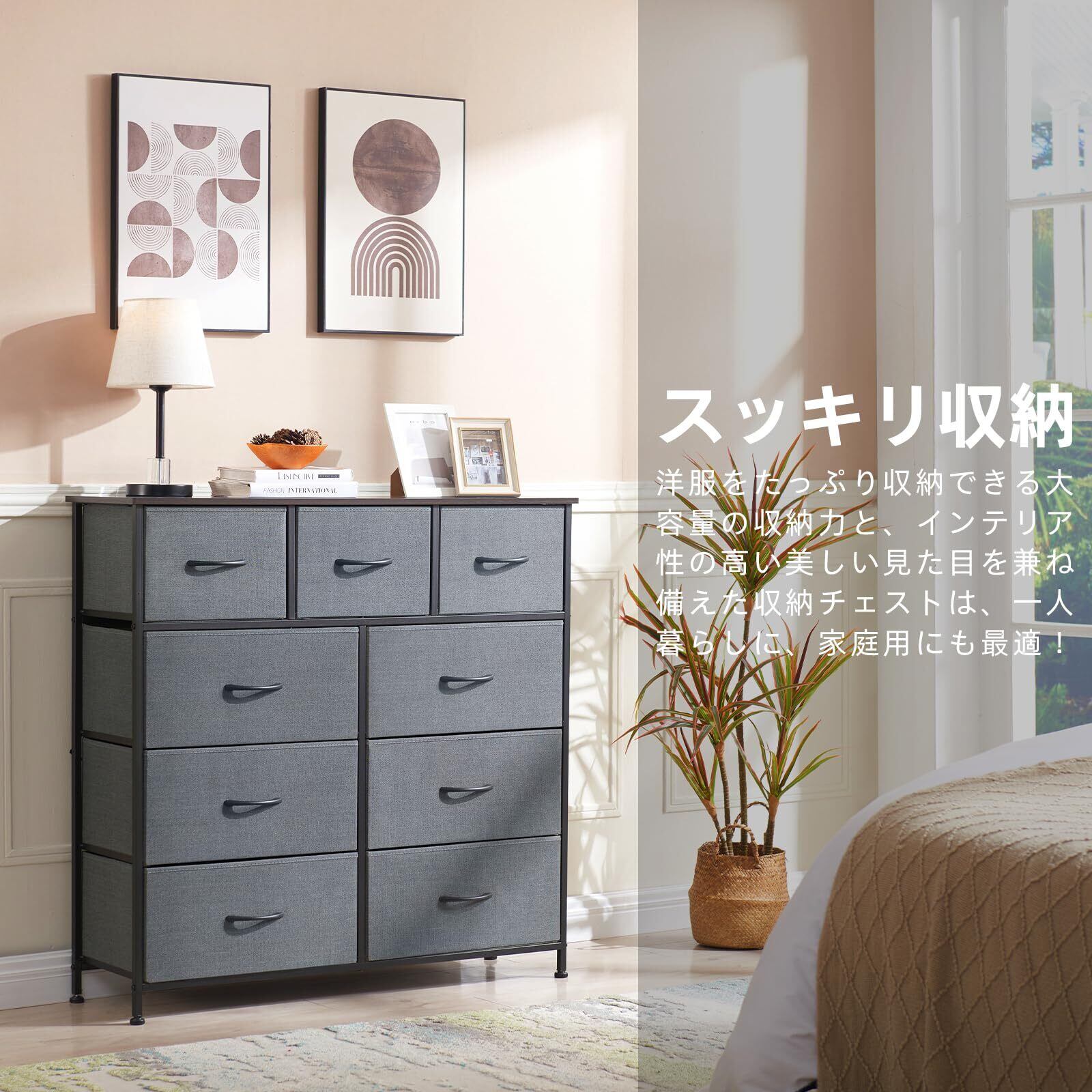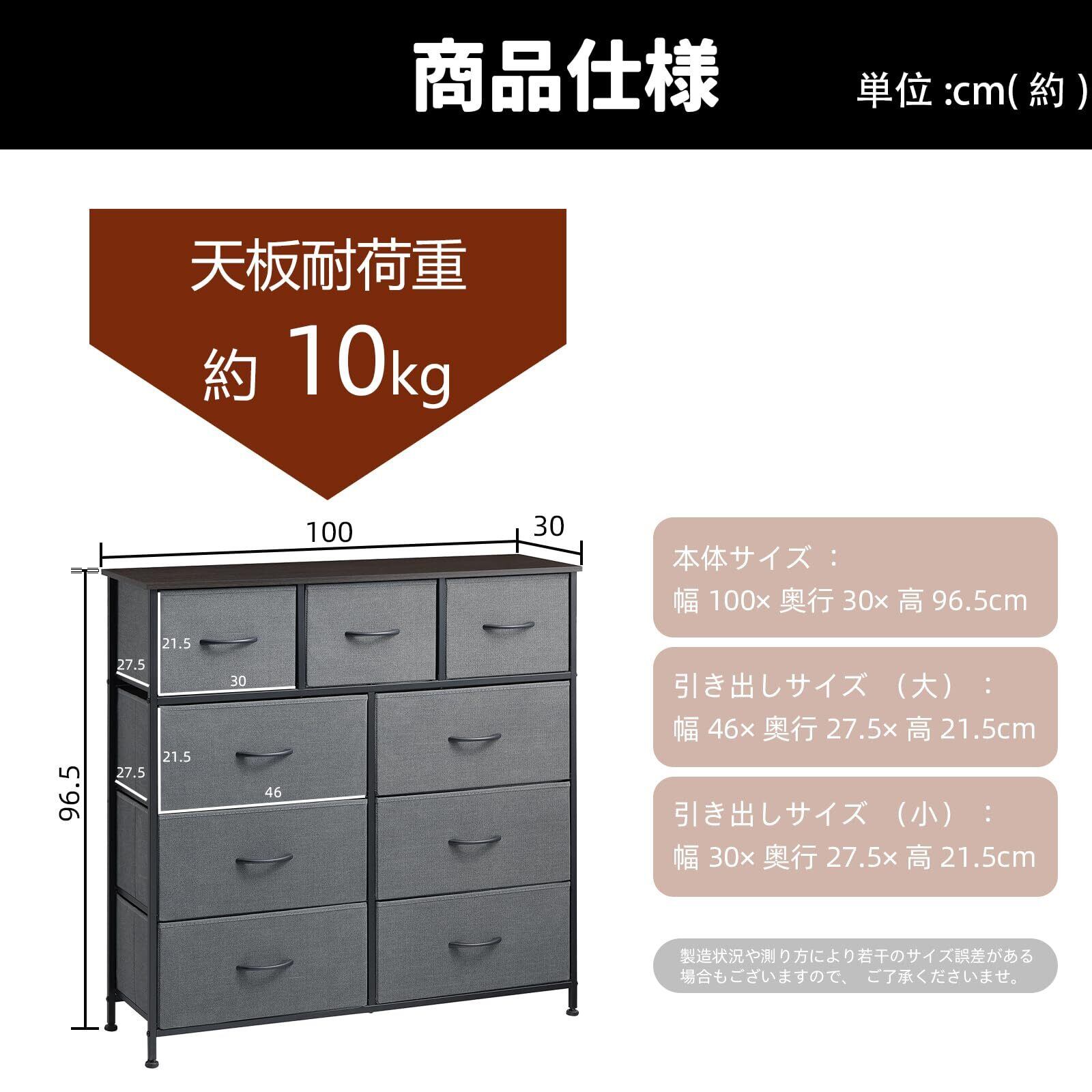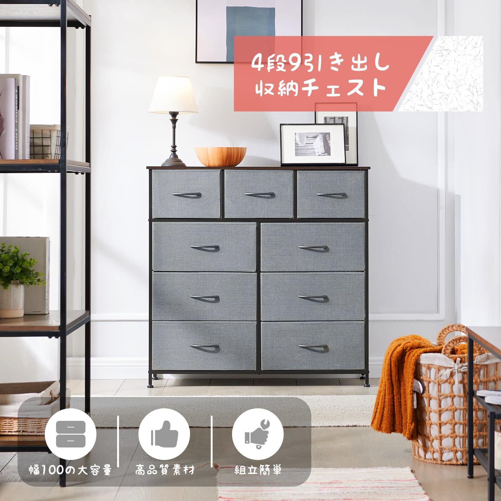 Somdot タンス チェスト 収納 引き出し 棚 おしゃれ 布製 洋服ダンス 箪笥 たんす 幅100 奥行30 大容量 衣装棚 ワイド 衣類 リビング 転倒防止 一人暮らし 4段9杯 ダークグレー