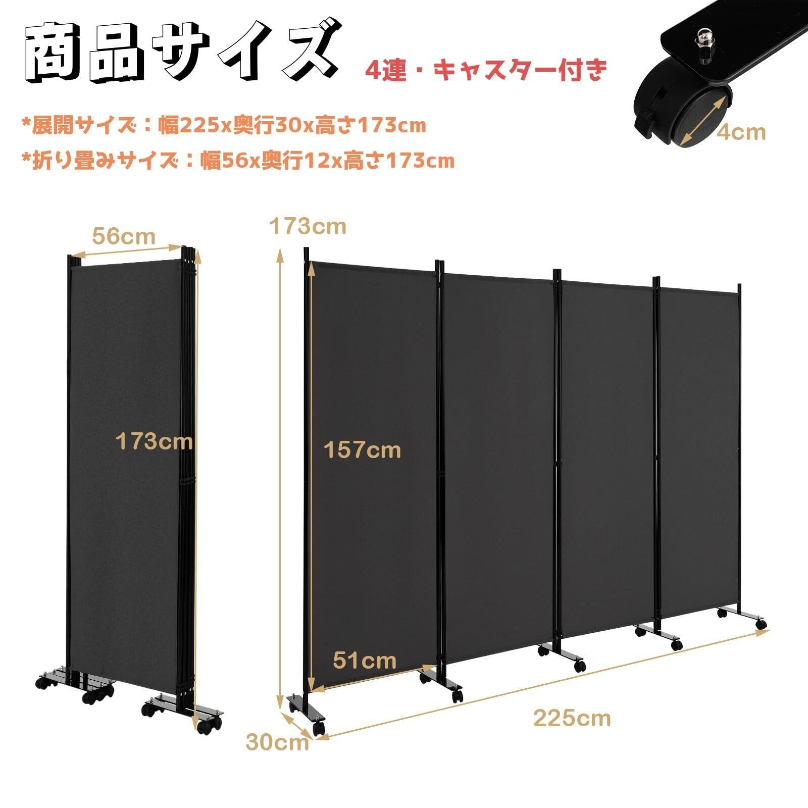 【新春セール】パーテーション 間仕切り 4連 幅225cm 高さ173cm キャスター付き グレー 透けない パーティション 目隠し 衝立 屏風 スクリーン 部屋仕切り 事務所 オフィス 会議室 相談式 クリニック 病院 カフェ 家 ホテル 室内