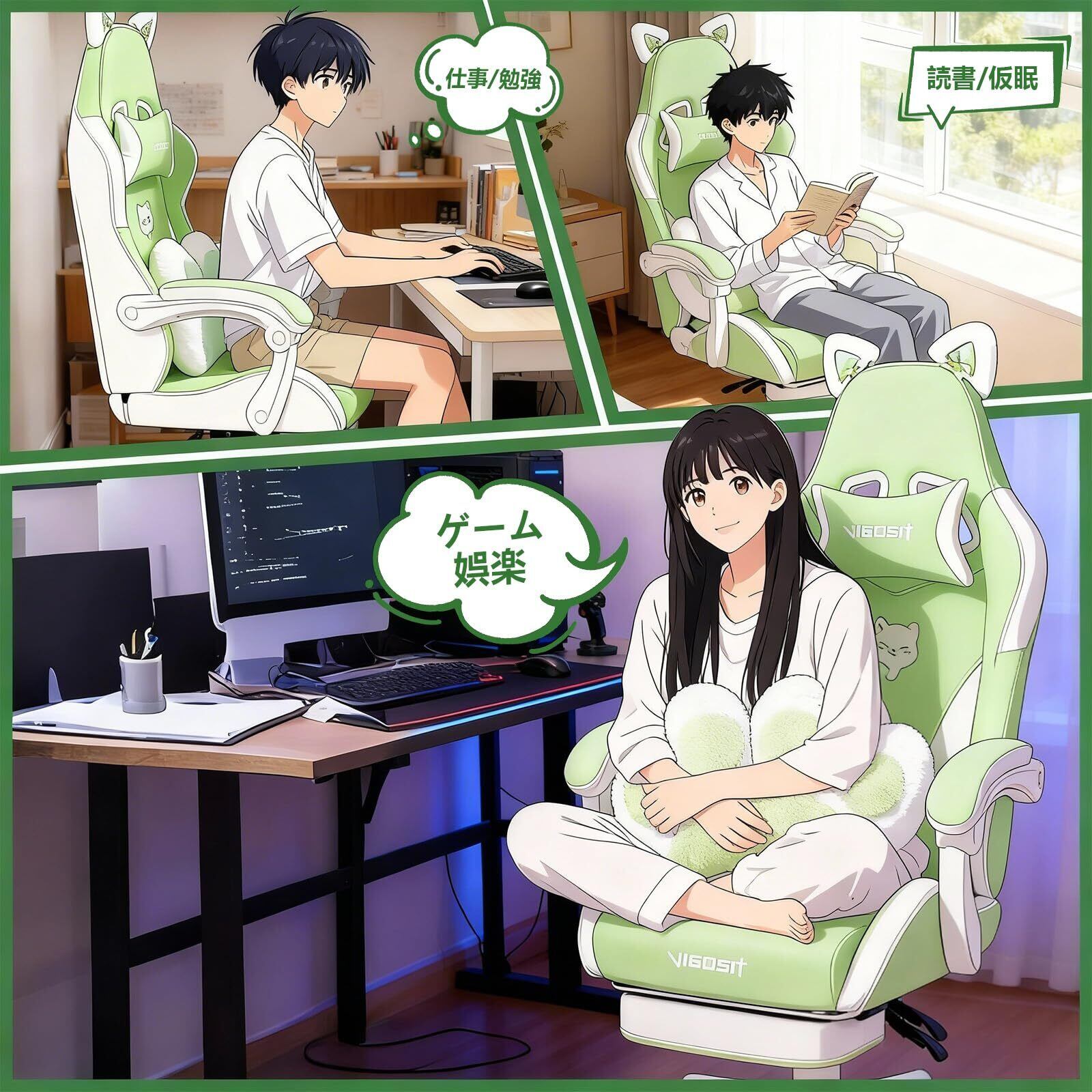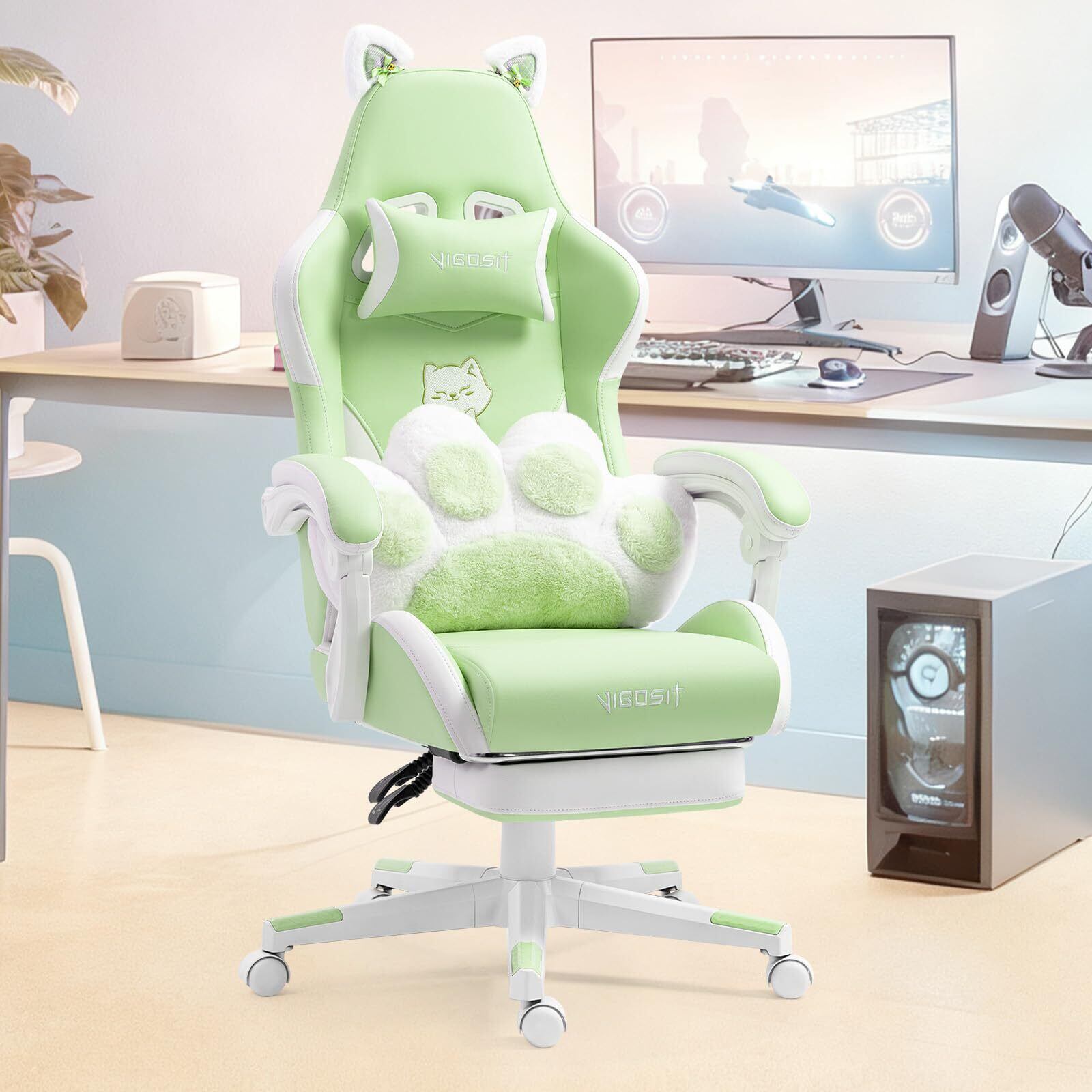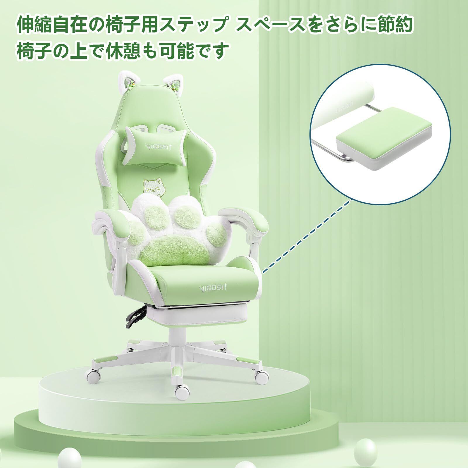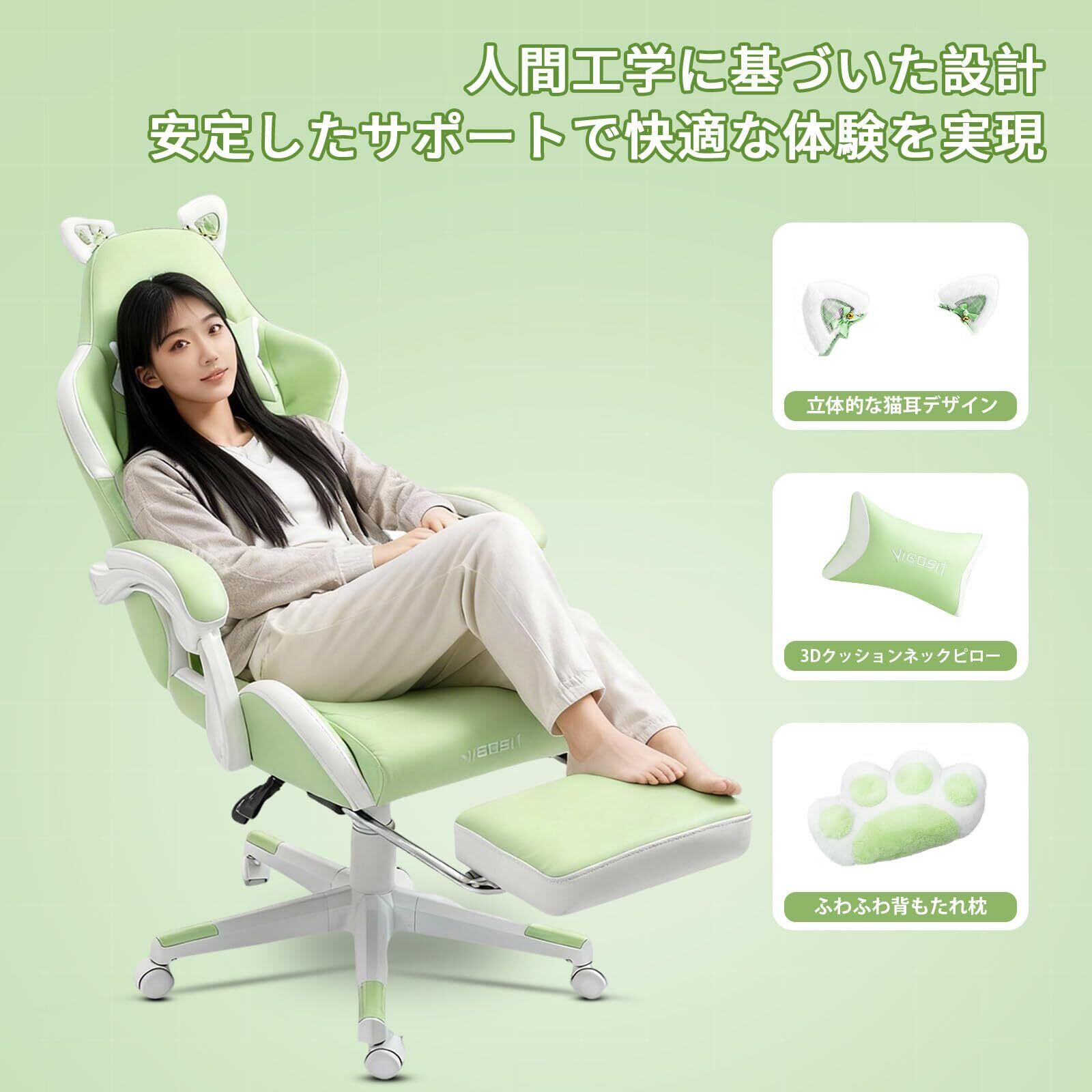キュート ゲーミングチェア(猫の足型腰枕と猫の耳付き)、人間工学に基づいたゲーミング(フットレスト付き)、調整可能なPCゲーミングチェア(女の子、ティーンエイジャー、子供向け)、グリーン