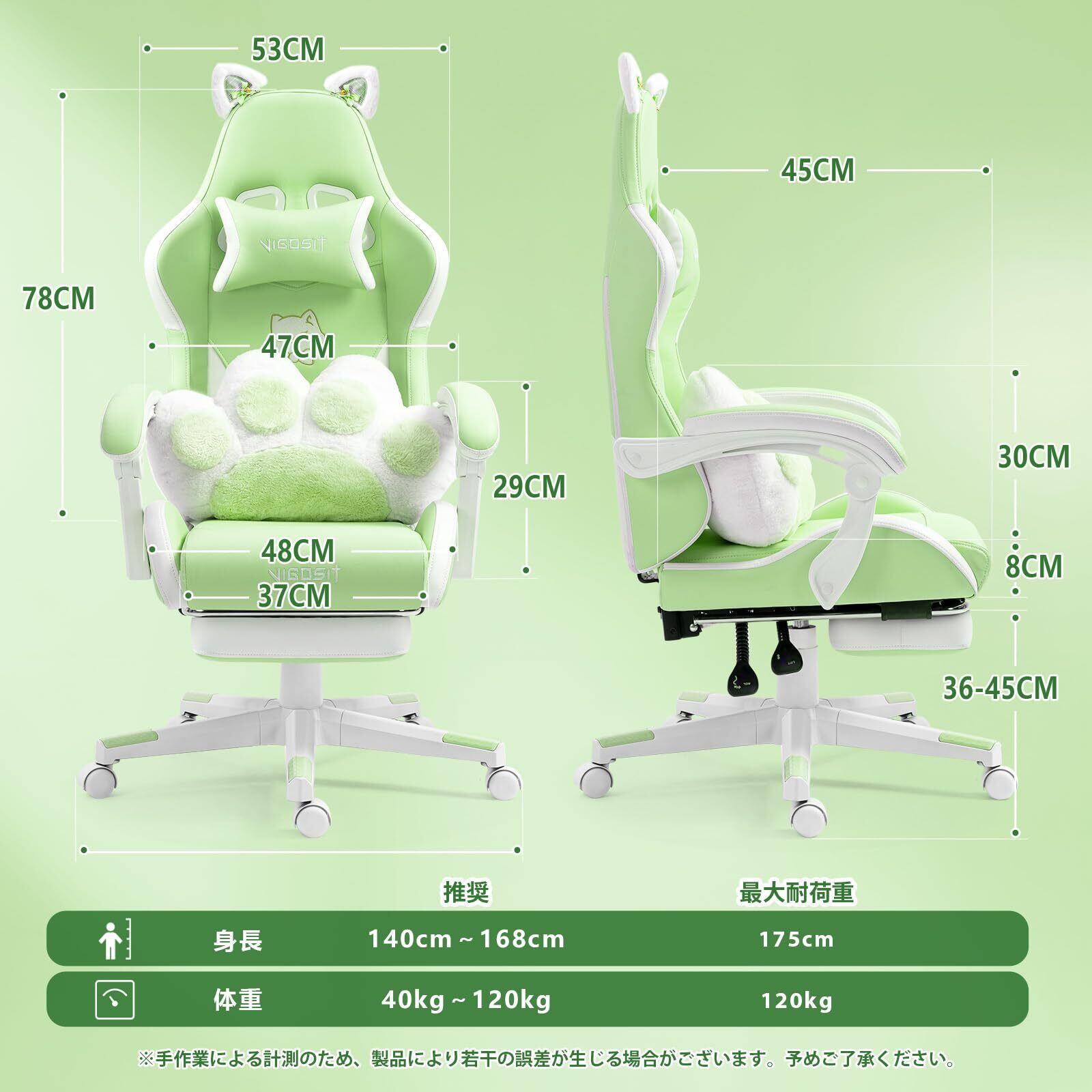 【在庫処分】キュート ゲーミングチェア(猫の足型腰枕と猫の耳付き)、人間工学に基づいたゲーミング(フットレスト付き)、調整可能なPCゲーミングチェア(女の子、ティーンエイジャー、子供向け)、グリーン
